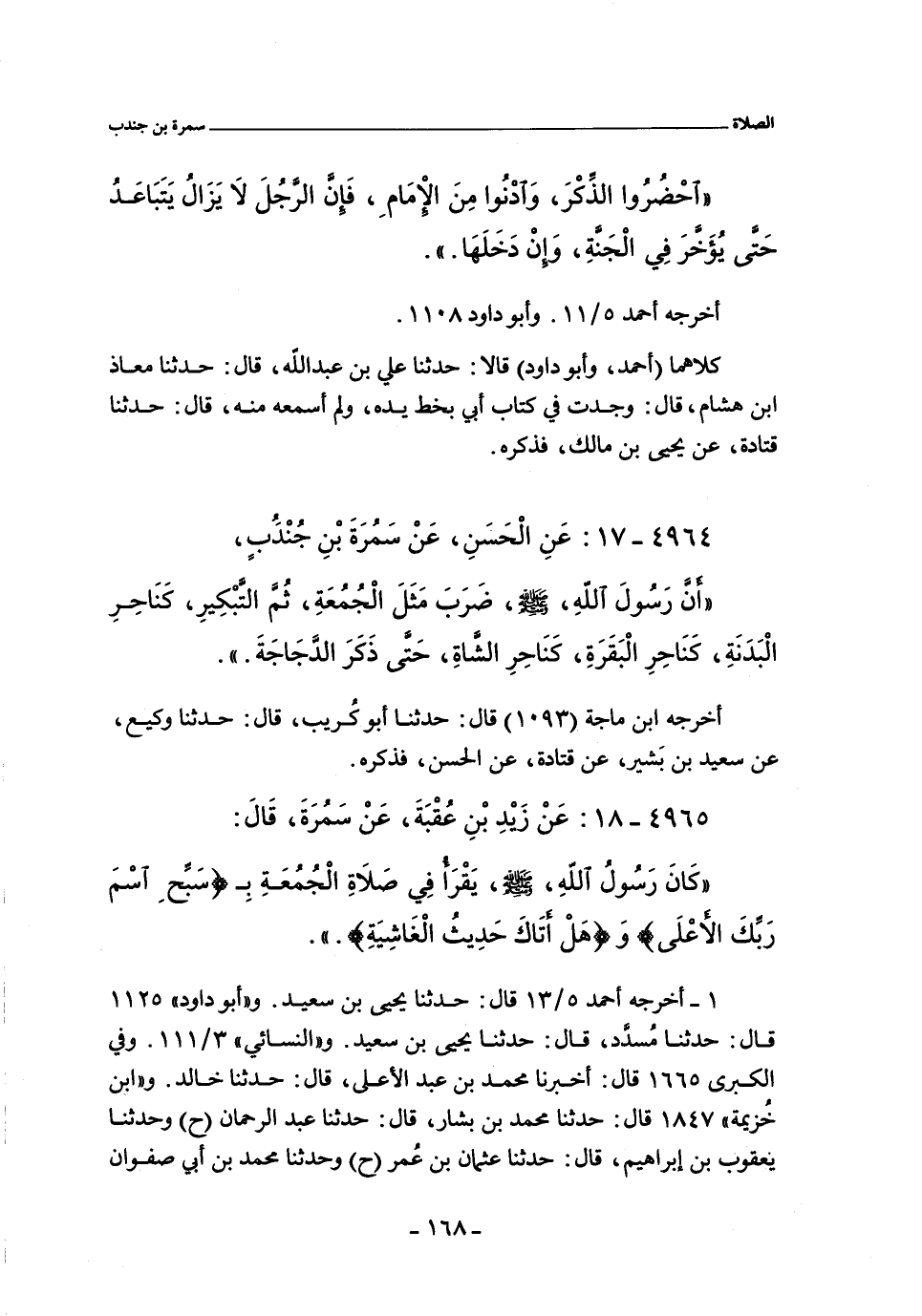 كلاهما (أحمد، وأبو داود) قالا: حدثنا على بن عبد الله , حدثنا معاذ بن هشام , قال: وجدت في كتاب أبي بخط يده , ولم أسمعه منه , حدثنا قتادة , عن يحيى بن مالك، فذكره.