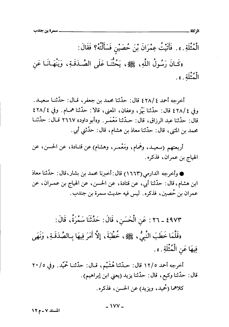 (*) وفي رواية: قَالَ يُونُسُ: نُبَئتُ اَن المسوَرَ بِنَ مخرمة جاء إِلى الحَسَنِ. فَقَالَ: إِن غُلَامًا لِي أَبَقَ، فَنَذَرتُ إِن أَنَا عَايَنتُهُ أَنْ أَقْطَعَ يَدَهُ، فَقَدْ جَاءَ فَهُوَ اَلآن بِالجِسْرِ؟ قَالَ: فَقَالَ الحَسَنُ: لَا تَقْطَعْ يَدَهُ، وَحَدَّثَهُ أَنَّ رَجُلَا قَالَ لِعِمرَانَ بن حُصَينٍ: إِن عَبداَ لِي أَبَقَ ليَ إِنِّي نَذَرتُ إِن أَنَا عَايَنتُهُ أَن أَفطَعَ يَدَهُ؟ تَقطَع يَدَهُ، فَإِن رَسُولَ الله صلى الله عليه وسلم كَانَ يَوُمُّ فِينَا - أَو قَالَ: يَقُومُ فِينَا - فَيَأمُرُنَا بِالصدَقَةِ وَيْنَهَانَا عَنِ المثلة.