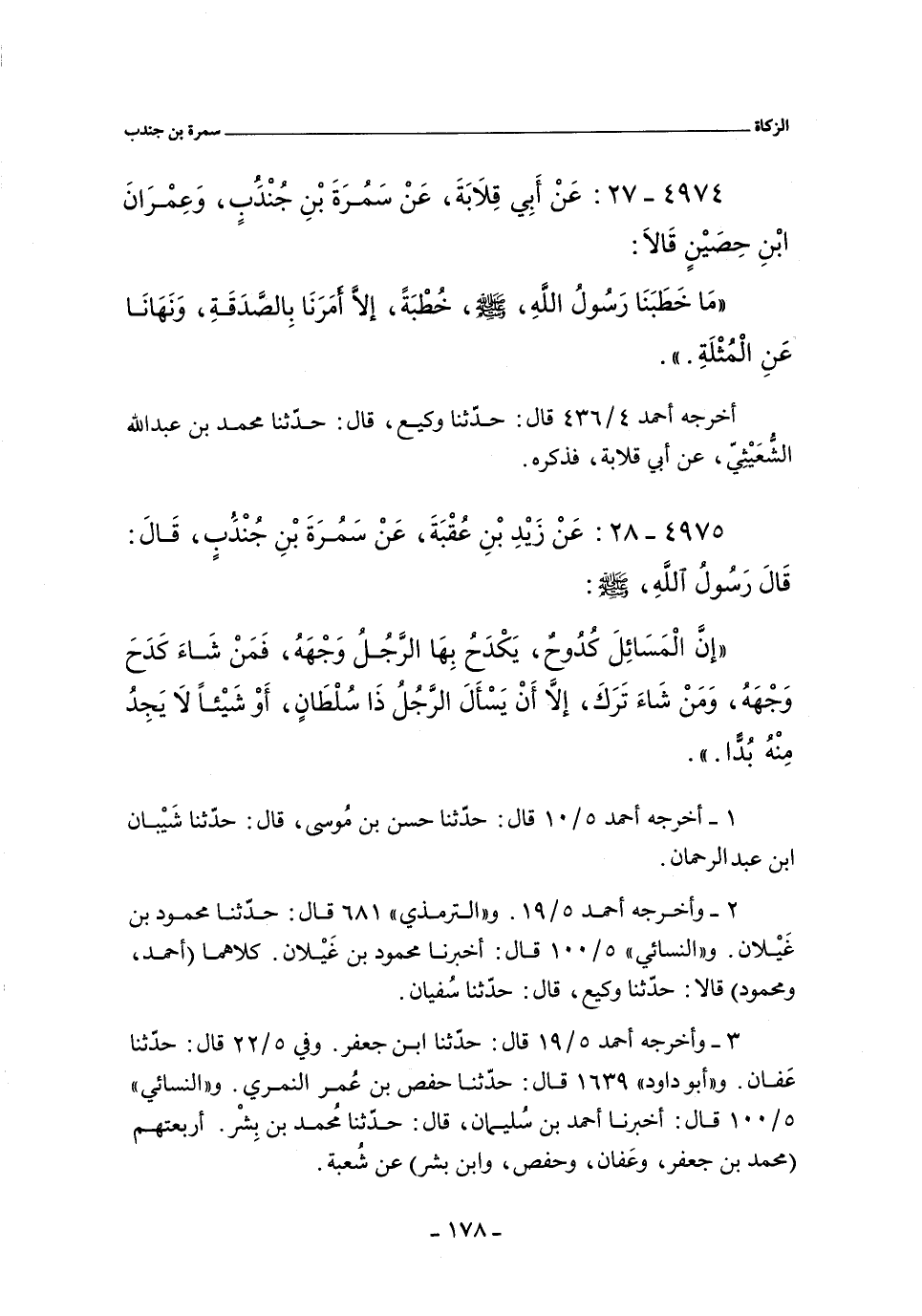 إن الْمَسَائِلُ كُدُوحٌ , يَكْدَحُ بِهَا الرَّجُلُ وَجْهَهُ , فَمَنْ شَاءَ كدح وَجْهِهِ , وَمَنْ شَاءَ تَرَكَ , إِلَاّ أَنْ يَسْأَلَ الرَّجُلُ ذَا سُلْطَانٍ , أَوْ شيئا لَا يَجِدُ مِنْهُ بُدًّا.