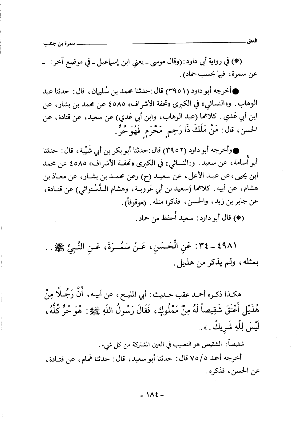 كلاهما (عبد الوهاب، وابن أَبي عَدي) عن سعيد، عن قَتَادة، عن الحسن. قال: مَن مَلَكَ ذَا رحِم مَحرَم فهو حُرُّ.
