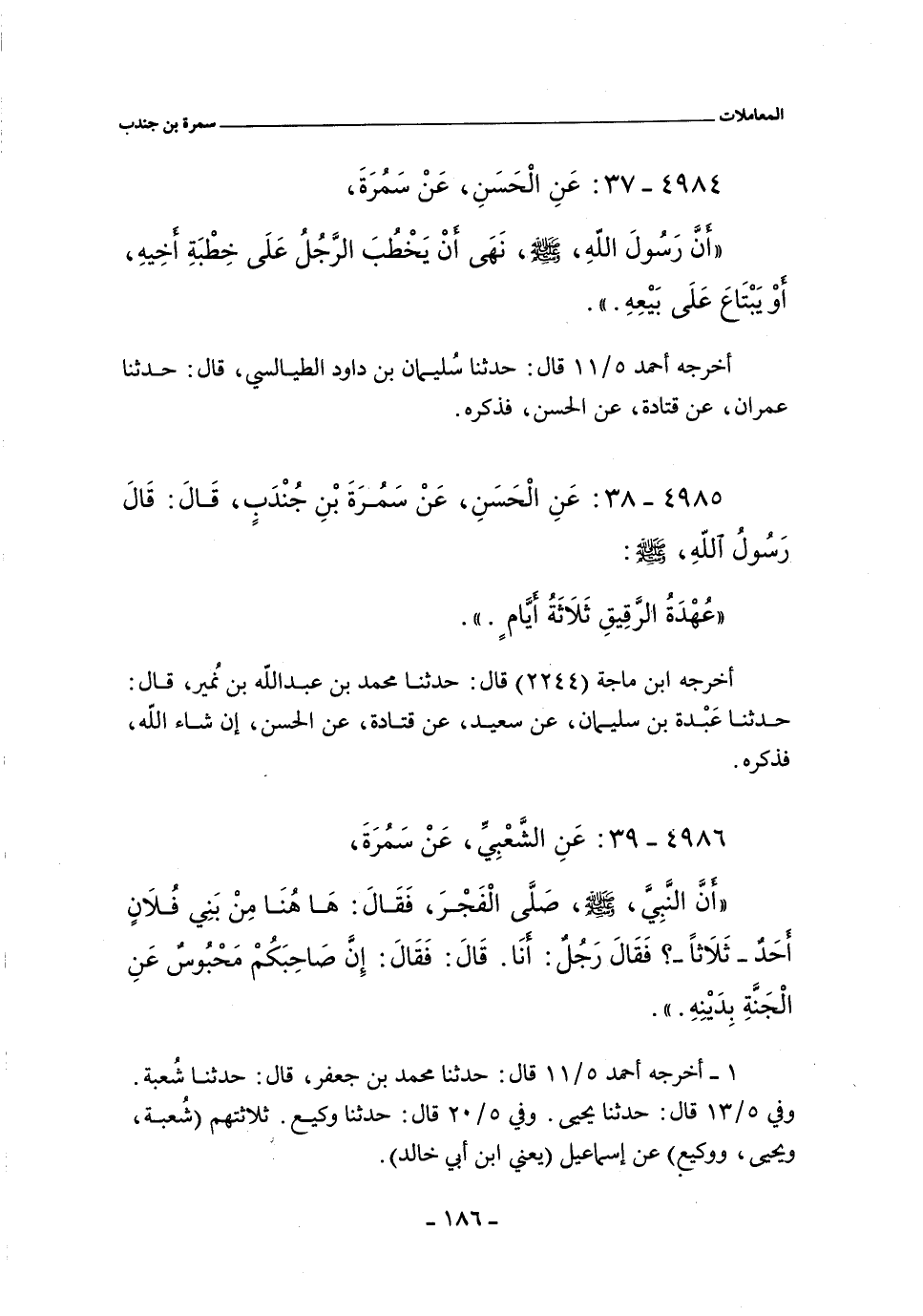 ٤٩٨٥ - عَنِ اَلْحَسَنِ، عَنْ سَمُرَةَ بن جُندَبِ، قَالَ رَسُولُ اَللُّهِ، صلى الله عليه وسلم: