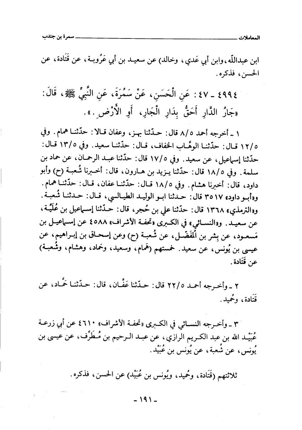 أخرجه أحمد ٥/ ٨ (٢٠٤٨) قال: حدثنا بَهز، وعفّان , قالا: حدثنا همّام، عن قَتَادة. وفي ٥/ ١٢ (٢٠٣٩٠) قال: حدثنا عَبْد الوهاب الخَفاف، حدثنا سَعِيد، عن قتَادة. وفي ٥/ ١٣ (٢٠٤٠٩) قال: حدثنا إسماعيل، عن سعيد، عن قَتَادة. وفي ٥/ ١٧ (٢٠٤٤٥) قال: حدثنا عَبْد الرحمن، عن حمّاد بن سلمة، عن قَتَادة. وفي ٥/ ١٨ (٢٠٤٥٨) قال: حدثنا عفان، حدثنا همام، أخبرنا قَتَادة. وفي ٥/ ١٨ (٢٠٤٦٢) قال: حدثنا يزيد بن هارون، أنبأنا شُعبة (ح) وأبو داود، أنبأنا هشام، عن قَتَادة. وفي ٥/ ٢٢ (٢٠٥١٥) قال: حدثنا عفّان، حدثنا حماد، عن قَتَادة، وحُميد. و"أبو داود" ٣٥١٧ قال: حدثنا أبو الوليد الطيالسي، حدثنا شُعْبة، عن قَتَادة. والتِّرْمِذِيّ" ١٣٦٨ قال: حدثنا علي بن حُجر، حدثنا إسماعيل بن عُلَية، عن سعيد، عن قَتَادة. و"النَّسَائي" في "الكبرى" ١١٧١٧ عن إسماعيل بن مسعود، عن بِشر بن المُفَضل، إسحاق بن إبراهيم عن عيسى بن يونس، عن سعيد، عن قَتَادة. وفي "الكبرى" عن أَبي زرعة عُبيد الله بن عبد الكريم الرازي، عن عبد الرحيم بن مُطَرف، عن عيسى بن يونس، عن شُعبة، عن يونس بن عُبيد.