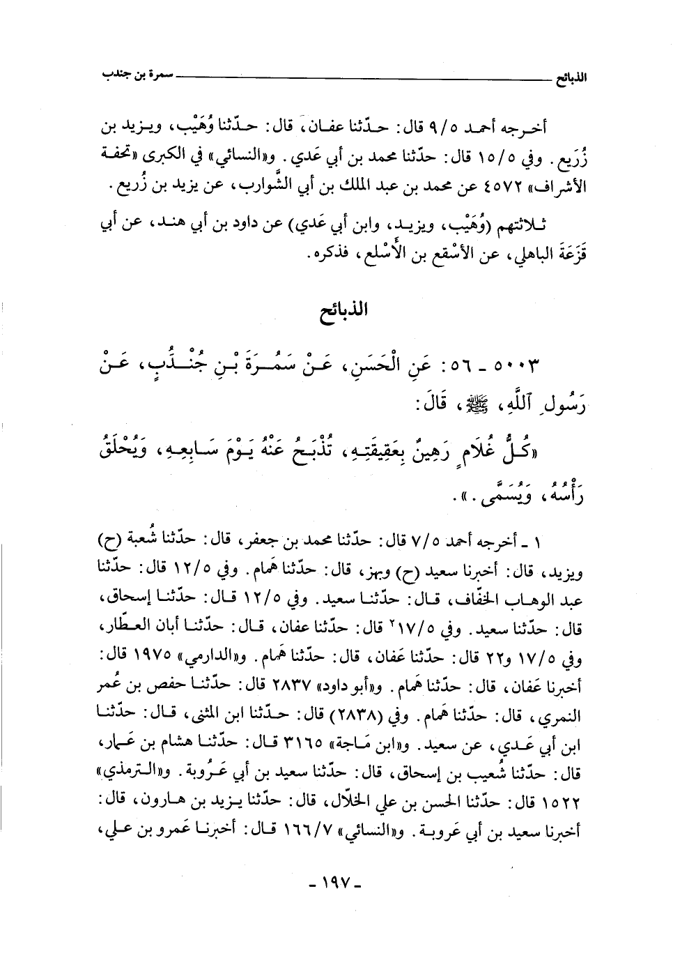 أخرجه أحمد ٥/ ٧ (٢٠٣٤٣) قال: حدثنا محمد بن جعفر، حدثنا سَعِيد (ح) ويزيد , قال: أنبأنا سعيد (ح) وَبَهز، حدثنا همام. وفي ٥/ ١٢ (٢٠٣٩٥) قال: حدثنا عَبْد الوهاب الخَفاف، حدثنا سَعِيد. وفي ٥/ ١٢ (٢٠٤٠١) قال: حدثنا إسحاق بن يوسف، حدثنا سَعِيد. وفي ٥/ ١٧ (٢٤٥١ و ٢٠٤٥٧) قال: حدثنا عقان، حدثنا أبان العَطار. وفي ٥/ ١٧ (٢٠٤٥٦) و ٥/ ٢٢ (٢٠٥٢٠) قال: حدثنا عفّان، حدثنا همّام. و"الدارمي" ١٩٦٩ قال: أخبرنا عفّان، حدثنا همّام (ح) قال عفّان: حدثنا أَبَان. و"أبو داود" ٢٨٣٧ قال: حدثنا حفص بن عُمر النمري، حدثنا همام. وفي (٢٨٣٨) قال: حدثنا ابن المُثنى، حدثنا ابن أَبي عَدي، عن سعيد. و"ابن ماجة" ٣١٦٥ قال: حدثنا هشام بن عمّار، حدثنا شُعيب بن إسحاق، حدثنا سَعِيد بن أَبي عَرُوبة. والتِّرْمِذِيّ" ١٥٢٢ قال: حدثنا الحسن بن علي الخَلال، حدثنا يزيد بن هارون، أخبرنا سعيد بن أَبي عَرُوبة. و"النَّسَائي" ٧/ ١٦٦، وفي "الكبرى" ٤٥٣٢ قال: أخبرنا عَمرو بن علي،