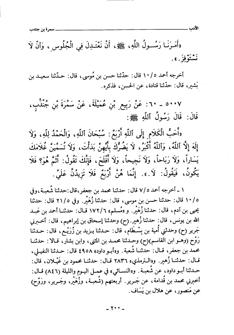 ٥٠٠٧ - عن ربيع بن عميلة , عن سمرة بن جندب , قال: قال رسول الله صلى الله عليه وسلم: أحب الكلام إلى الله أربع: سبحان الله , والحمد لله , ولا إله إلا الله , والله أكبر , لا يضرك بأيهن بدأت , ولا تسمين غلاممك يسار , ولا رباحا , ولا نجيحا , ولا أفلح , فإنك تقول: أثم هو؟ فلا يكون , فيقول: لا.
