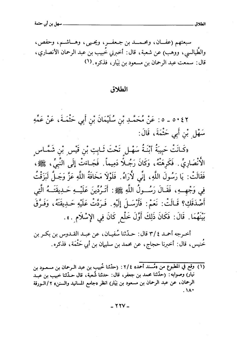 كَانَتْ حَبِيبَةُ ابْنَةُ سَهْلٍ تَحْتَ ثَابِتِ بْنِ قَيْسِ بْنِ شَمَّاسٍ الأَنْصَارِيِّ , فَكَرِهَتْهُ , وَكَانَ رَجُلاً دَمِيمًا , فَجَاءَتْ إِلَى النَّبيىِّ , صلى الله عليه وسلم , فَقَالَتْ: يَا رَسُولَ الله , إِنِّي لَا أَرَاهُ , فَلَوْلَا مَخَافَةُ الله , عَزَّ وَجَلَّ , لَبَزَقْتُ فِى وَجْهِهِ , فَقَالَ رَسُولُ الله صلى الله عليه وسلم: أَتَرُدِّينَ عَلَيْهِ حَدِيقَتَهُ الَّتِي أَصْدَقَكِ؟ قَالَتْ: نَعَمْ: فَأَرْسَلَ إِلَيْهِ , فَرَدَّتْ عَلَيْهِ حَدِيقَتَهُ , وَفَرَّقَ بَيْنَهُمَا. قَالَ: فَكَانَ ذَلِكَ أَوَّلَ خُلْعٍ كَانَ فِى الإِسْلَامِ.