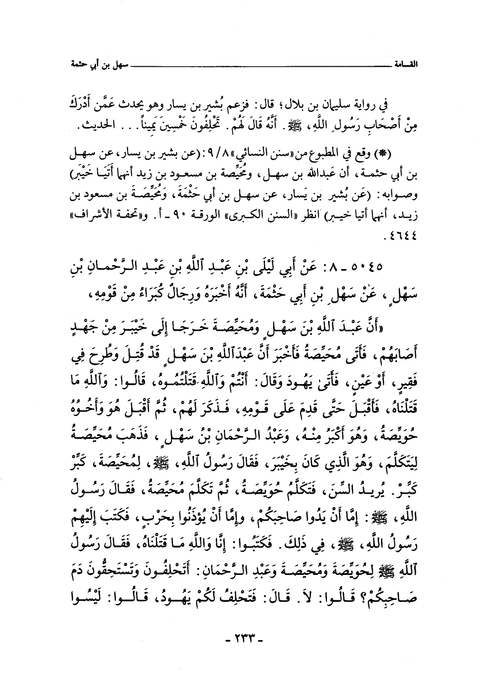 أَنَّ عَبْدَ الله بْنَ سَهْلٍ وَمُحَيِّصَةَ خَرَجَا إِلَى خَيْبَرَ مِنْ جَهْدٍ أَصَابَهُمْ , فَأُتِىَ مُحَيِّصَةُ فَأُخْبِرَ أَنَّ عَبْدَ الله بْنَ سَهْلٍ قَدْ قُتِلَ , وَطُرِحَ فِى فَقِيرِ , أَوْ عَيْنٍ , فَأَتَى يَهُودَ. وَقَالَ: أَنْتُمْ وَالله قَتَلْتُمُوهُ , َقَالُوا: وَالله مَا قَتَلْنَاهُ , فَأَقْبَلَ , حَتَّى قَدِمَ عَلَى قَوْمِهِ , فَذَكَرَ لَهُمْ , ثُمَّ أَقْبَلَ هُوَ وَأَخُوهُ حُوَيِّصَةُ , وَهُوَ أَكْبَرُ مِنْهُ , وَعَبْدُ الرَّحْمَانِ بن سهل , فَذَهَبَ مُحَيِّصَةُ لِيَتَكَلَّمَ , وَهُوَ الَّذِى كَانَ بِخَيْبَرَ , فَقَالَ رَسُولُ الله , صلى الله عليه وسلم , كَبِّرْ كَبِّرْ , يُرِيدُ السِّنَّ , فَتَكَلَّمَ حُوَيِّصَةُ , ثُمَّ تَكَلَّمَ مُحَيِّصَةُ , فَقَالَ رَسُولُ الله , صلى الله عليه وسلم: إِمَّا أَنْ يَدُوا صَاحِبَكُمْ , وَإِمَّا أَنْ يُؤْذِنُوا بِحَرْبٍ , فَكَتَبَ إِلَيْهِمْ رَسُولُ الله , صلى الله عليه وسلم , فِى ذَلِكَ , فَكَتَبُوا إِنَّا وَالله مَا قَتَلْنَاهُ , فَقَالَ رَسُولُ الله صلى الله عليه وسلم لِحُوَيِّصَةَ وَمُحَيِّصَةَ وَعَبْدِ الرَّحْمَانِ: أَتَحْلِفُونَ وَتَسْتَحِقُّونَ دَمَ صَاحِبِكُمْ؟ وَقَالُوا: لَا. قَالَ: َفَتَحْلِفُ لَكُمْ يَهُودُ , قَالُوا: لَيْسُوا