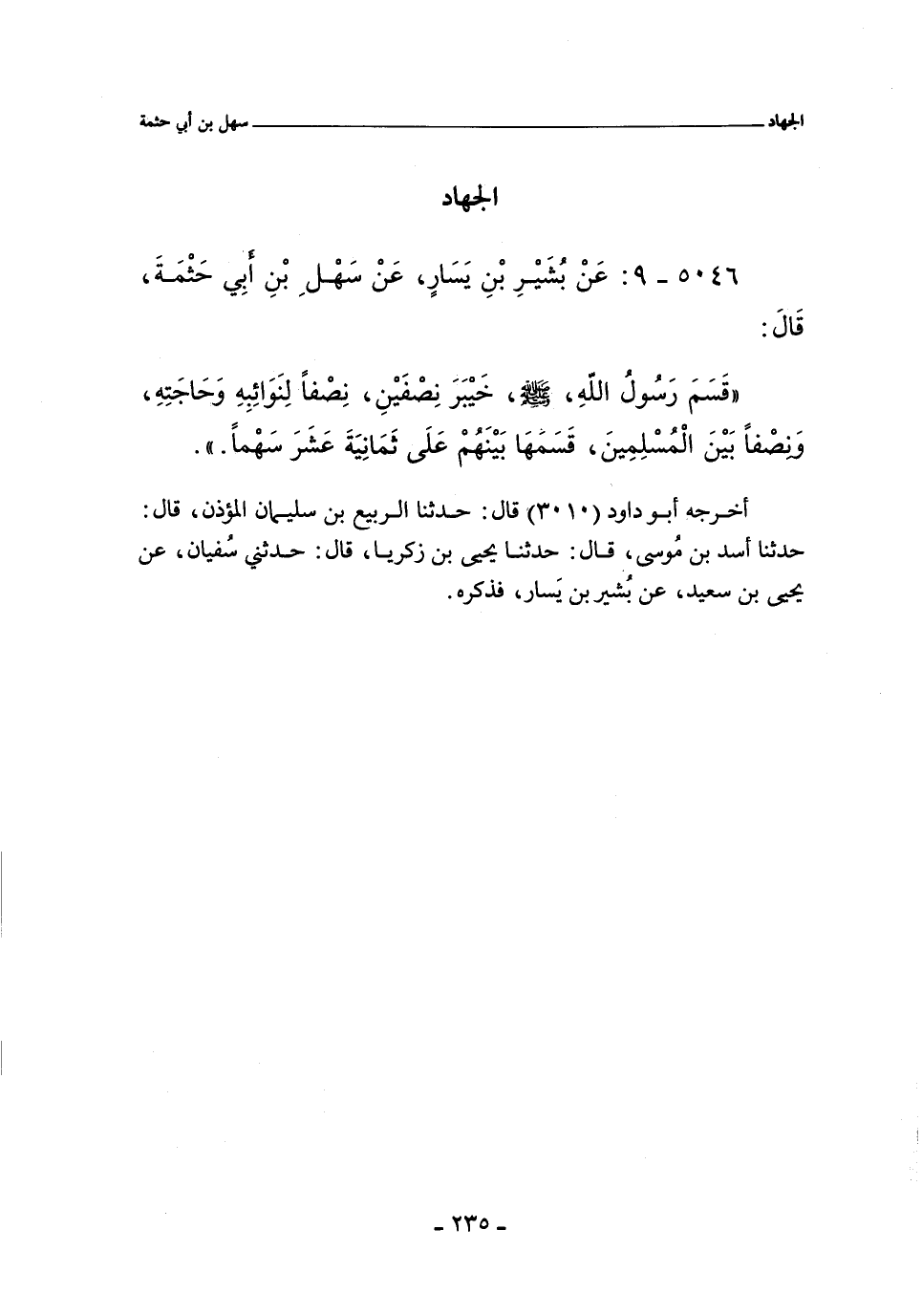 - أخرجه أبو داود (٣٠١١) قال: حدثنا حسين بن علي بن الأسود، أن يحيى بن آدم حدثهم، عن أَبي شهاب، عن يحيى بن سعيد، عن بُشير بن يسار، أنه سمع نفرا من اْصحابِ النبي، صلى الله عليه وسلم، قالوا:. فذكر هذا الحديث، قال: فَكَانَ النضفُ سِهَامُ المُسلِمِينَ، وَسَهمَ رَسُولِ الله، صلى الله عليه وسلم، وَعَزَلَ النضفَ للمسِلِمينَ، لِمَا يَنُوبُهُ مِنَ الأُمُورِ وَالنوَائِمبِ.