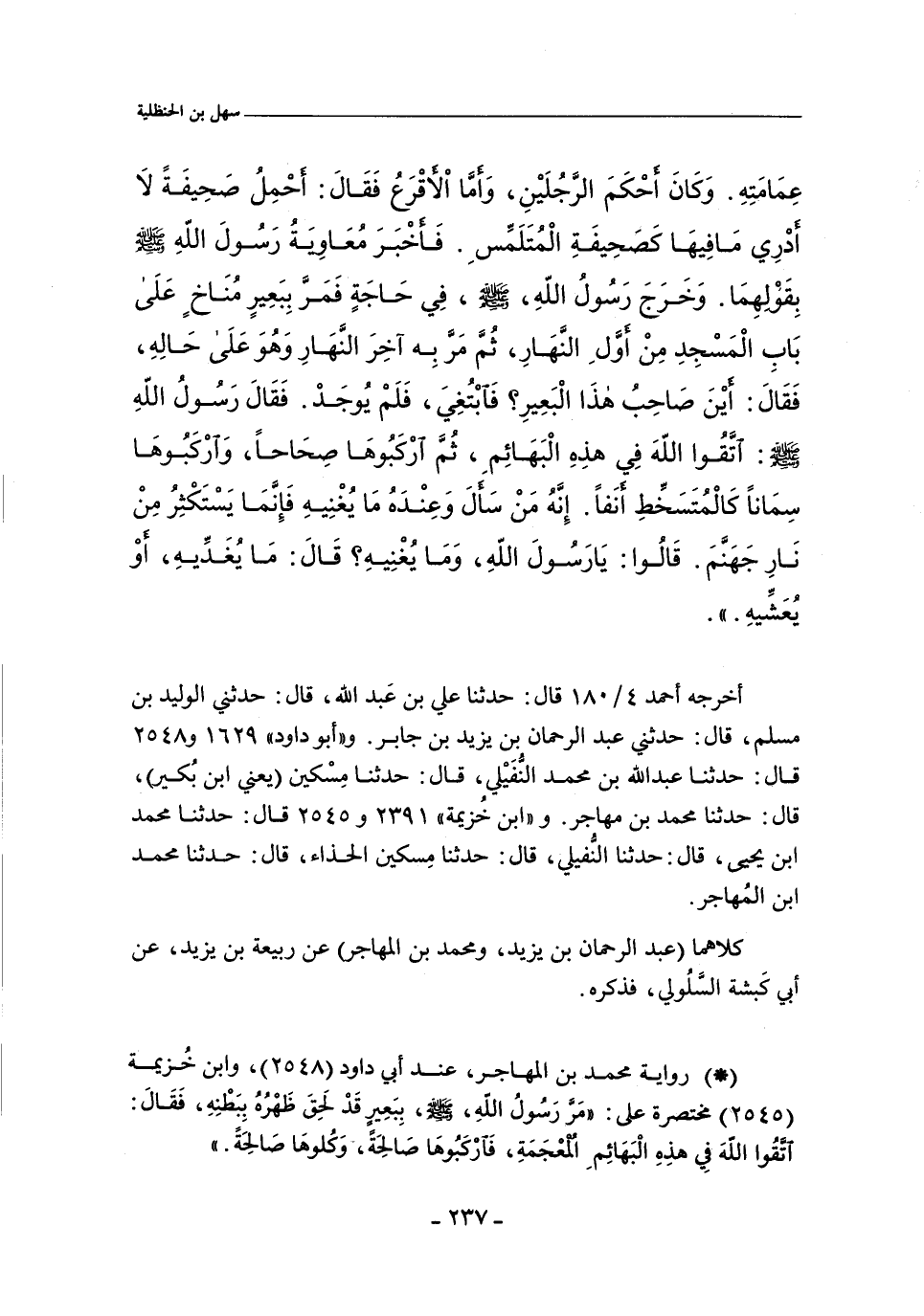 (*) رواية محمد بن المهاجر , عند أبي داود (٢٥٤٨) , وابن خزيمة (٢٥٤٥) مختصرعلى (مَر رَسُولُ الله، صلى الله عليه وسلم، بِبَعِيبر قَد لَحِقَ ظَفرُهُ بِبَطْنِهِ، فَقَالَ: اتقُوا الله فِي هَذِهِ الْبَهَائِمِ اَلمُعجَمَة، فَاَرْكَبُوهَا صَالِحَة ً، وَكُلوهَا صَالِحَةَ.