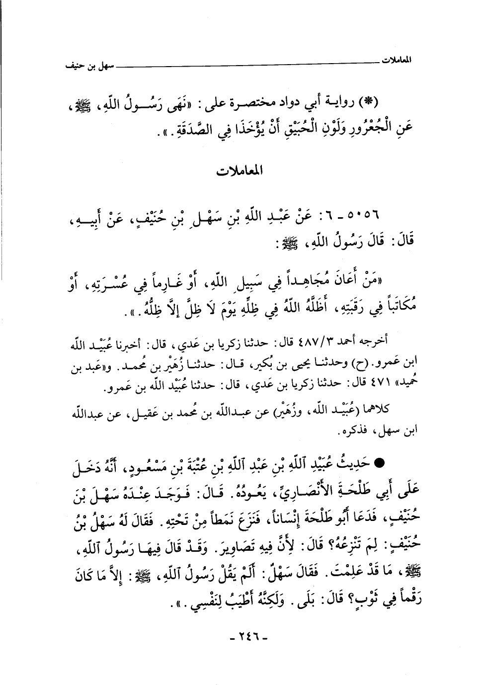- حَدِيثُ عُبَيْدِ الله بْن عَبْدِ اللهِ بْن عُتبَةَ بن مسعُودٍ، أَنهُ دَخَلَ عَلَىٍ أَبي طلحة الأنصاري، يَعُودُهُ. قال: فَوَجَد عِنْدهُ سَهْل بن حنيف , فدعا أبو طلحَة إِنسَانا، فنَزَعَ نَمَطا مِن تحتِهِ، فقال له سهل بن حُنَيْفٍ: لِمَ تَتزِعُهُ؟ قَالَ: لأنَ فِيهِ تَصَاوِير َ، وَقَد قَالَ فِيهَا رَسُولُ الله صلى الله عليه وسلم، مَا قَدْ عَلِمتَ. فَقَالَ سَهل: أَلَمْ يَقُل رَسُولُ الله صلى الله عليه وسلم: إلَا مَا كَانَ رَقماَ فِي ثَوب؟ قَالَ: بَلَى، وَلَكِنَّهُ أَطيَبُ لنقسِي.