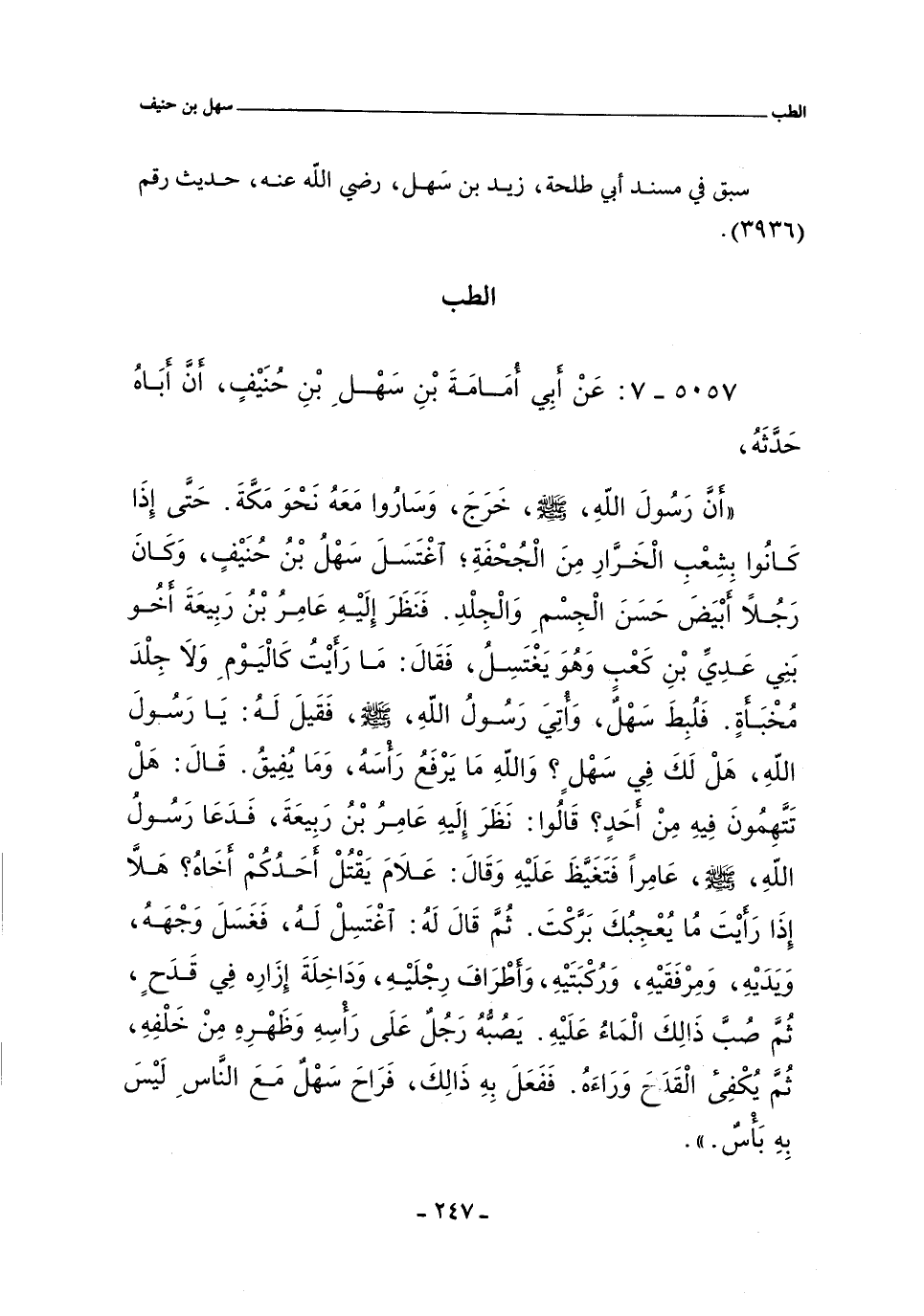 أَن رَسُولَ الله صلى الله عليه وسلم، خَرَجَ، وَسَارُوا مَعَهُ نَحوَ مَكةَ، حَتَّى إِذَا كَانُوا بِشِعبِ الخَرارِ مِنَ الجُحفَةِ اَغْتَسَلَ سَهْلُ بن حُنَيف، وَكَانَ رَجُلَا أبيَضَ، حَسَنَ الجِسمِ وَالجِلْدِ، فَنَظَرَ إِلَيهِ عَامِرُ بْنِ رَبِيعَةَ أَخُو بني عَدِي بْنِ كَعبٍ وَهُوَ يَغتَسِلُ، فَقَالَ: مَا رَأَيتُ كَاليوم وَلَا جِلدَ مُخبَأَةِ، فَلُبِطَ بِسَهل، فَاُتِيَ رَسُولُ أللًهِ صلى الله عليه وسلم، فَقَيلَ لَهُ: يَا رَسُولَ الله، هَل لَكَ فِي سَهْلٍ؟ وَالله مَا يرفَعُ رَأسَهُ، وَمَا يُفِيقُ. قَالَ: هَل تَتهِمُونَ فِيهِ مِنْ أَحَدِ؟ قَالُوا: نَطَرَ إِلَيهِ عامِرُ بن رَبِيعَةَ، فَدَعَا رَسُولُ الله صلى الله عليه وسلم، عَامِرا فَتَغَيظَ عَلَيهِ وَقَالَ: عَلَامَ يَقتُلُ أَحَدُكُمْ أَخَاهُ هَلأ إِذَا رَأَيْتَ مُا يُعجِبُكَ بَركتَ، ثُم قَالَ لَهُ: أغتَسِل لَهُ، فَغَسَلَ وَجهَهُ، ويديه، ومرفقيه , وركبتيه , وأطراف رجليه , وَدَاخِلَةَ إِزَارِه فِي قَدَحِ، ُثم صُب ذَلِكَ المَاءُ عَلَيهِ، يَصُبُّهُ رَجُلٌ عَلَى رَأْسِهِ وَظَهْرِهِ مِنْ خَلفِهِ، ثُمُّ يُكْفِىُء القَدَحَ وَرَاءَهُ، فَفَعَلَ بِهِ ذَالِكَ، فَرَاحَ سَهل مَعَ الناسِ لَيسَ بِهِ بأس.