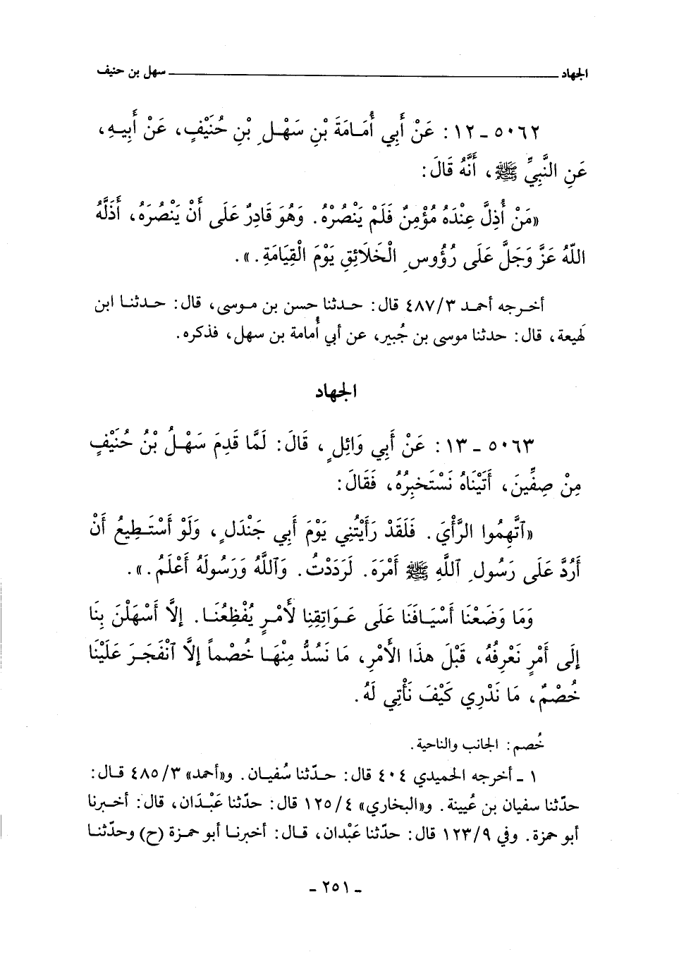 ٥٠٦٣ - عَن أَبي وَائِلٍ، قَالَ: لَما قَدِمَ سَهل بنُ حُنَيفٍ مِن صِفينَ، أَتَينَاهُ نَستَخبِرُهُ، فَقَالَ: