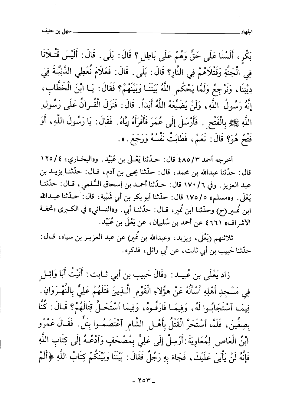 زاد يَعْلَى بْنُ عُبَيْدٍ: قال حَبِيبِ بْنِ أَبِى ثَابِتٍ: أَتَيْتُ أَبَا وَائِلٍ فِى مَسْجِدِ أَهْلِهِ أَسْأَلُهُ عَنْ هَؤُلَاءِ الْقَوْمِ الَّذِينَ قَتَلَهُمْ عَلِىٌّ بِالنَّهْرَوَانِ فِيمَا اسْتَجَابُوا لَهُ وَفِيمَا فَارَقُوهُ وَفِيمَا اسْتَحَلَّ قِتَالَهُمْ قَالَ كُنَّا بِصِفِّينَ فَلَمَّا اسْتَحَرَّ الْقَتْلُ بِأَهْلِ الشَّامِ اعْتَصَمُوا بِتَلٍّ فَقَالَ عَمْرُو بْنُ الْعَاصِ لِمُعَاوِيَةَ أَرْسِلْ إِلَى عَلِىٍّ بِمُصْحَفٍ وَادْعُهُ إِلَى كِتَابِ الله فَإِنَّهُ لَنْ يَأْبَى عَلَيْكَ فَجَاءَ بِهِ رَجُلٌ فَقَالَ بَيْنَنَا وَبَيْنَكُمْ كِتَابُ الله (أَلَمْ