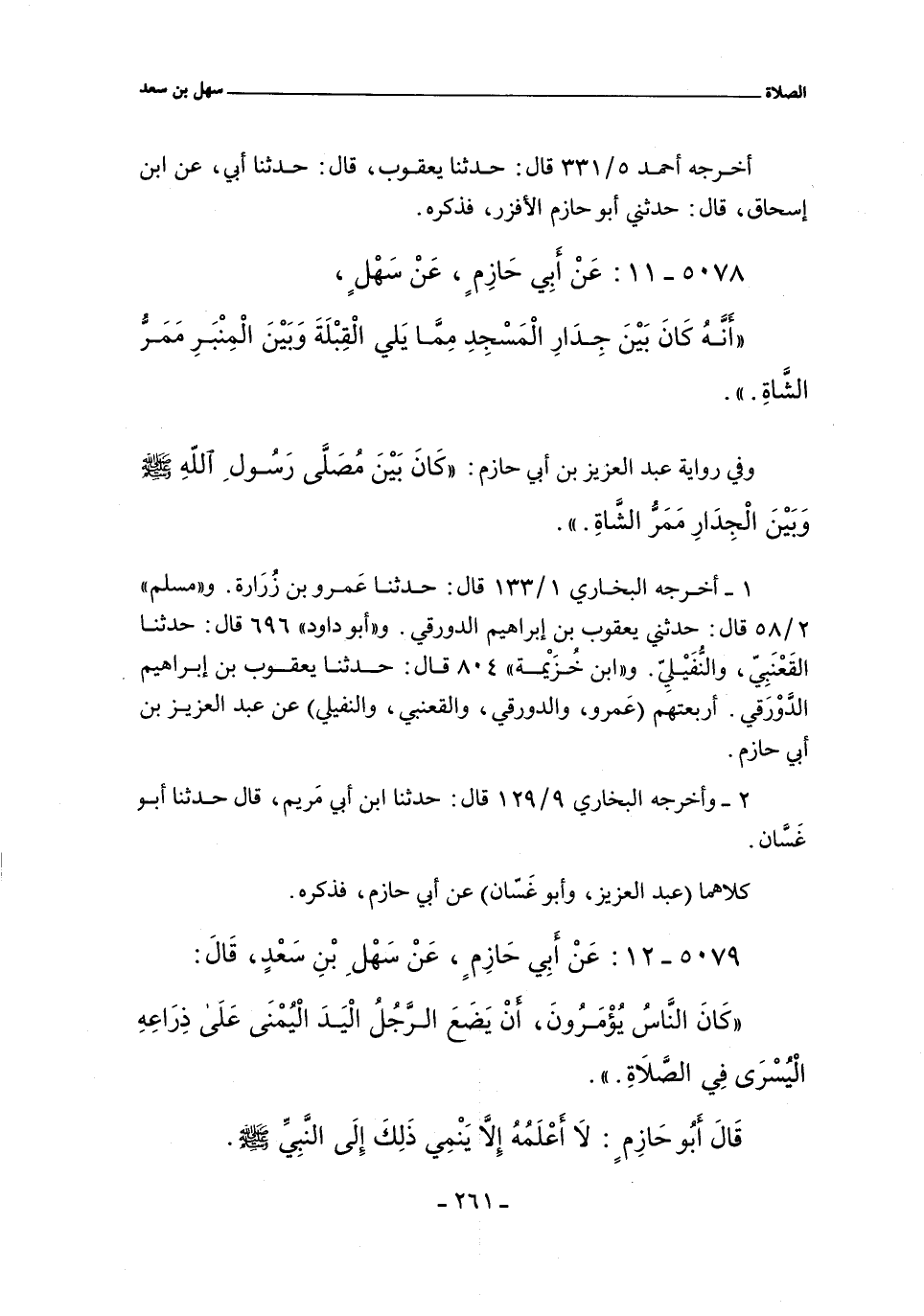 أخرجه البخاري ١/ ١٣٣ (٤٩٦) قال: حدثنا عَمرو بن زرارة , قال: أخبرنا عبد العزيز بن أَبي حازم. وفي ٩/ ١٢٩ (٧٣٣٤) قال: حدثنا ابن أَبي مَريم، حدثنا أبو غَسان. و"مسلم" ٢/ ٥٨ (١٥٦٩) قال: حدَّثني يعقوب بن إبراهيم الدورقي، حدثنا ابن أَبي حازم. و"أبو داود" ٦٩٦ قال: حدثنا القَعنبي، والنفَيلي , قالا: حدثنا عَبْد العزيز بن أَبي حازم. و"ابن خزيمة" ٨٥٤ قال: حدثنا يعقوب بن إبراهيم الدورقي، حدثنا ابن أَبي حازم.