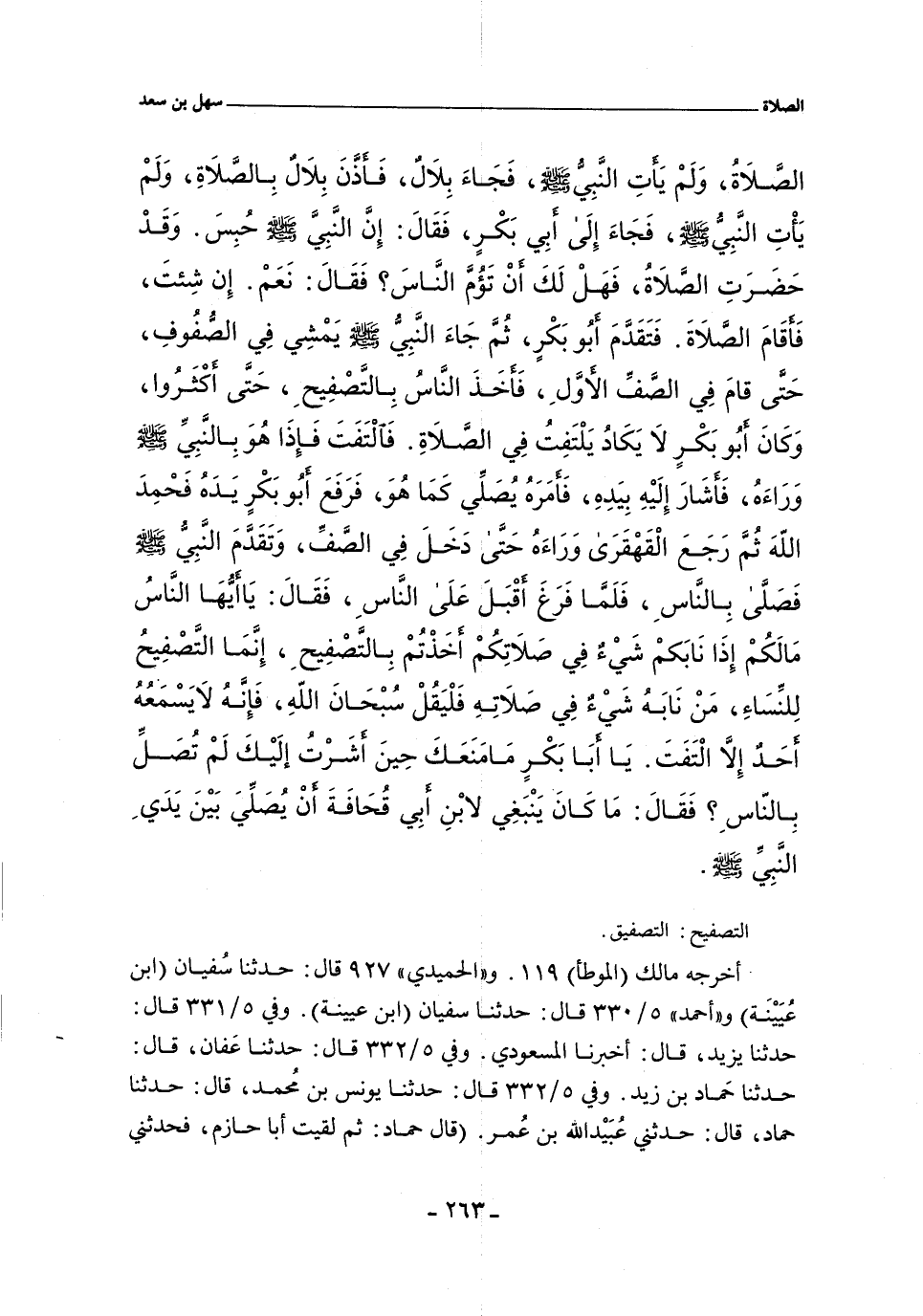 الصَّلَاةُ، وَلَمْ يَأْتِ النَّبِيُّ صلى الله عليه وسلم، فَجَاءَ بِلَالٌ، فَأَذَّنَ بِلَالٌ بِالصَّلَاةِ، وَلَمْ يَأْتِ النَّبِيُّ صلى الله عليه وسلم , فَجَاءَ إِلَى أَبِى بَكْرٍ , فَقَالَ: إِنَّ النَّبيَّ صلى الله عليه وسلم حُبِسَ، وَقَدْ حَضَرَتِ الصَّلَاةُ , فَهَلْ لَكَ أَنْ تَؤُمَّ النَّاسَ؟ فَقَالَ: نَعَمْ , إِنْ شِئْتَ , فَأَقَامَ الصَّلَاةَ , فَتَقَدَّمَ أَبُو بَكْرٍ، ثُمَّ جَاءَ النَّبيُّ صلى الله عليه وسلم يَمْشِى فِى الصُّفُوفِ، حَتَّى قَامَ فِى الصَّفِّ الأَوَّلِ، فَأَخَذَ النَّاسُ بِالتَّصْفِيحِ , حَتَّى أَكْثَرُوا، وَكَانَ أَبُو بَكْرٍ لَا يَكَادُ يَلْتَفِتُ فِى الصَّلَاةِ، فَالْتَفَتَ فَإِذَا هُوَ بِالنَّبيِّ صلى الله عليه وسلم وَرَاءَهُ , فَأَشَارَ إِلَيْهِ بِيَدِهِ، فَأَمَرَهُ يُصَلِّى كَمَا هُوَ، فَرَفَعَ أَبُو بَكْرٍ يَدَهُ، فَحَمِدَ الله، ثُمَّ رَجَعَ الْقَهْقَرَى وَرَاءَهُ , حَتَّى دَخَلَ فِى الصَّفِّ، وَتَقَدَّمَ النَّبِيُ صلى الله عليه وسلم فَصَلَّى بِالنَّاسِ، فَلَمَّا فَرَغَ أَقْبَلَ عَلَى النَّاسِ , فَقَالَ: يَا أَيُّهَا النَّاسُ , مَا لَكُمْ إِذَا نَابَكُمْ شَىْءٌ فِى صَلَاتِكُمْ أَخَذْتُمْ بِالتَّصْفِيحِ، إِنَّمَا التَّصْفِيحُ لِلنِّسَاءِ، مَنْ نَابَهُ شَىْءٌ فِى صَلَاتِهِ فَلْيَقُلْ سُبْحَانَ الله، فَإِنَّهُ لا يَسْمَعُهُ أَحَدٌ إِلَاّ الْتَفَتَ، يَا أَبَا بَكْرٍ مَا مَنَعَكَ حِينَ أَشَرْتُ إِلَيْكَ لَمْ تُصَلِّ بِالنَّاسِ؟ فَقَالَ: مَا كَانَ يَنْبَغِى لاِبْنِ أَبِى قُحَافَةَ أَنْ