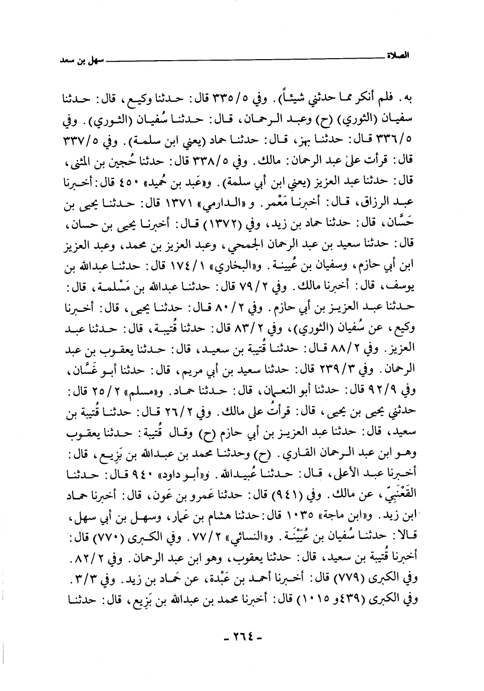 به. فلم أنكر مما حدَّثني شيئاً. وفي ٥/ ٣٣٥ (٢٣٢٣٣) قال: حدثنا وكيع، حدثنا سفيان (ح) وعبد الرحمن، حدثنا سُفيان. وفي ٥/ ٣٣٦ (٢٣٢٣٦) قال: حدثنا بهز، حدثنا حماد، يعني ابن سلمة. وفي ٥/ ٣٣٧ (٢٣٢٤٠) قال: قرأت عَلى عبد الرحمن: مالك. وفي ٥/ ٣٣٨ (٢٣٢٥١) قال: حدثنا حُجين بن المثنى، حدثنا عَبْد العزيز، يعني ابن أَبي سلمة. و"عَبْد الله بن أحمد" ٤٥٠ قال: أخبرنا عبد الرزاق، أخبونا مَعمر. و"الدارِمِي" ١٣٦٤ قال: حدثنا يحيى بن حَسان، حدثنا حماد بن زيد، وفي (١٣٦٥) قال: أخبرنا يحيى بن حسّان، حدثنا سعيد بن عبد الرحمن الجُمحي، وعبد العزيز بن محمد، وعبد العزيز بن أَبي حازم، وسُفيان بن عُيينة. و"البُخَارِي" ١/ ١٧٤ (٦٨٤) قال: حدثنا عبد الله بن يوسف , قال: أخبرنا مالك. وفي ٢/ ٧٩ (١٢٠١) قال: حدثنا عبد الله بن مَسلمة، حدثنا عبد العزيز بن أَبي حازم. وفي ٢/ ٨٠ (١٠٤) قال: حدثنا يحيى، أخبرنا وكيع، عن سُفيان. وفي ٢/ ٨٣ (١٢١٨) قال: حدثنا قُتيبة، حدثنا عَبْد العزيز. وفي ٢/ ٨٨ (١٢٣٤) قال: حدثنا قُتَيْبَة بن سعيد، حدثنا يعقوب بن عبد الرحمن. وفي ٣/ ٢٣٩ (٢٦٩٠) قال: حدثنا سَعِيد بن أَبي مريم، حدثنا أبو غَسَّان، وفي ٣/ ٢٤٠ (٢٦٩٣) قال: حدثنا محمد بن عبد الله , حدثنا عبد العزيز بن عبد الله الأويسي، وإسحاق بن محمد الفروي قالا: حدثنا محمد بن جعفر. وفي