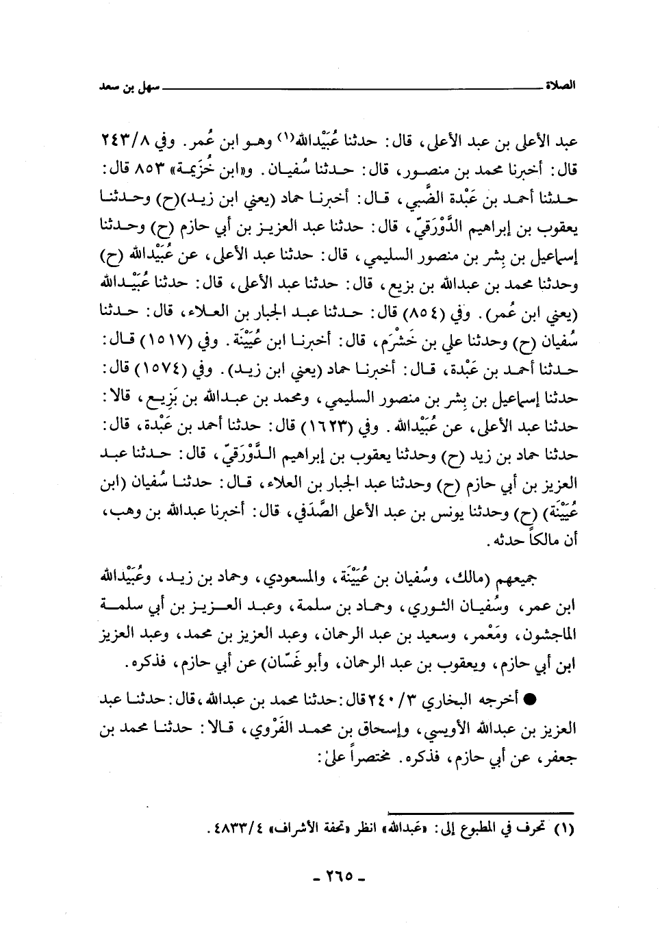 الأَعْلَى، قال محمد: حدثنا عُبَيْد الله. قال إسماعيل: عن عُبَيد الله. وفي (١٦٢٣) قال: حدثنا أحمد بن عَبدة، حدثنا حماد بن زَيد (ح) وحدثنا يعقوب بن إبراهيم الدورَقيّ، حدثنا عَبْد العزيز بن أَبي حازم (ح) وحدثنا عبد الجبار بن العلاء، وحدثنا سفيان (ح) وحدثنا يونس بن عبد الأعلى الصدفي , أخبرنا عبد الله بن وَهب، أن مالكًا حدثه.