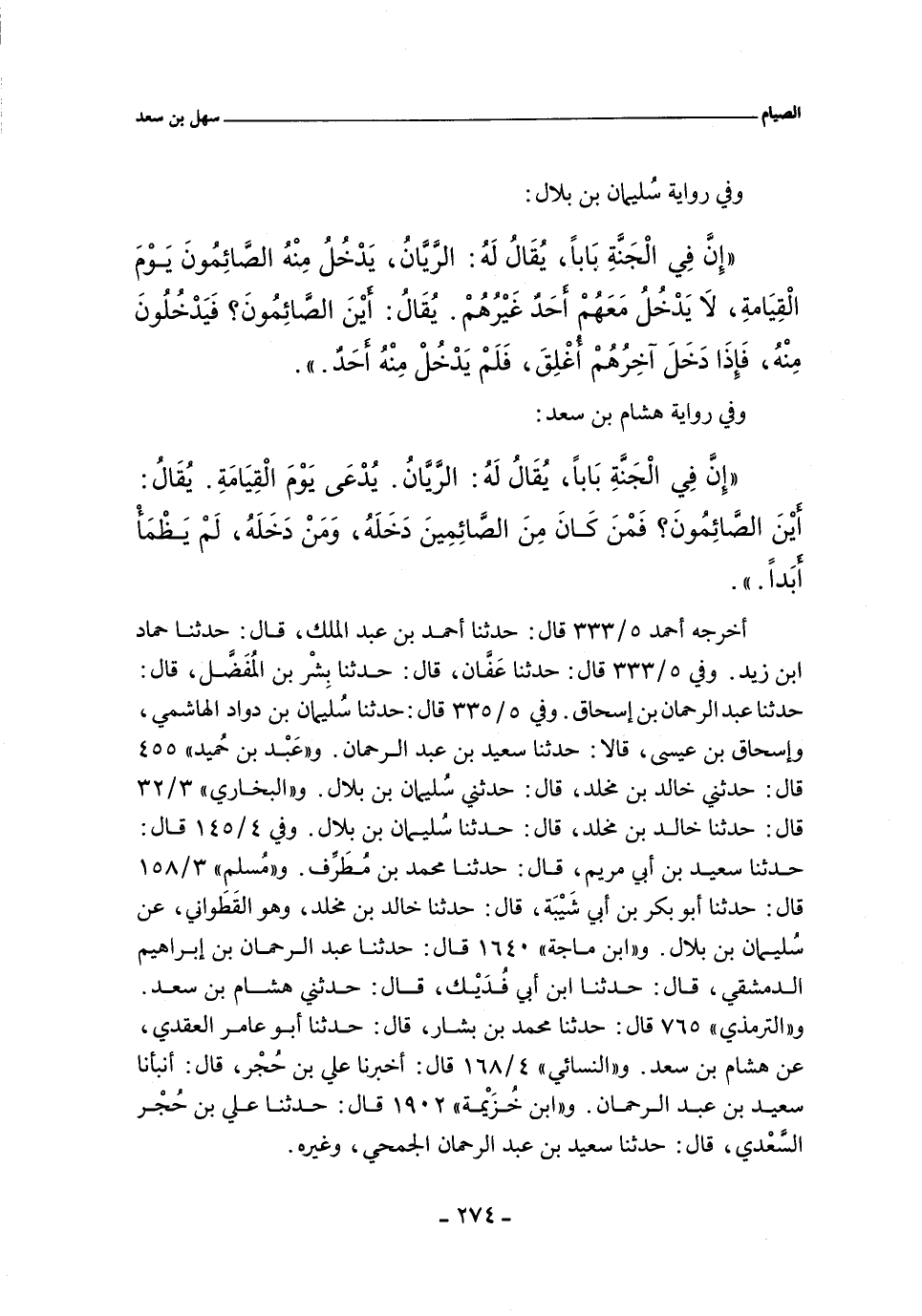 أخرجه أحمد ٥/ ٣٣٣ (٢٣٢٠٦) قال: حدثنا أحمد بن عبد الملك، حدثنا حماد بن زَيد. وفي ٥/ ٣٣٣ (٢٣٢٠٧) قال: حدثنا عَفَّان، حدثنا بِشْر بن المُفَضل، حدثنا عَبْد الرحمن بن إسحاق (قال بِشر بن المُفَضل: فلقيتُ أبا حازم فسالتُه فحدثني به، غير اْني لحديث عبد الرحمن أحفظ. وفي ٥/ ٣٣٥ (٢٣٢٣٠) قال: حدثنا سُلَيْمَان بن داود الهاشمي وإسحاق بن عيسى , قالا: حدثنا سَعِيد بن عبد الرحمن. و"عَبد بن حُميد" ٤٥٥ قال: حدَّثني خالد بن مخلد، قال: حدَّثني سُليمان بن بلال. و"البُخَارِي" ٣/ ٣٢ (١٨٩٦) قال: حدثنا خالد بن مَخلد، حدثنا سُلَيْمَان بن بلال. وفي ٤/ ١٤٥ (٣٢٥٧) قال: حدثنا سَعِيد بن أَبي مَريم، حدثنا محمد بن مُطَرِّف. ٨/ ١٥٣ (٢٦٨٠) قال: حدثنا أبو بكر بن أَبي شَيبة، حدثنا خالد بن مَخلد، وهو القَطَواني، عن سُليمان بن بلال. و"ابن ماجة" ١٦٤٠ قال: حدثنا عَبْد الرحمن بن إبراهيم الدمشقي، حدثنا ابن أَبي فُدَيك، حدَّثني هشام بن سهل. والتِّرْمِذِيّ" ٧٦٥ قال: حدثنا محمد بن بشار، حدثنا أبو عامر العَقَدي، عن هشام بن سهل. و"النَّسَائي" ٤/ ١٦٨، وفي "الكبرى" ٢٥٥٦ قال: أخبرنا علي بن حُجر , قال: أنبأنا سعيد بن عبد الرحمن. و"ابن خزيمة" ١٩٠٢ قال: حدثنا علي بن حجر السعدي، حدثنا سَعِيد بن عبد الرحمن الجُمحي، وغيره.