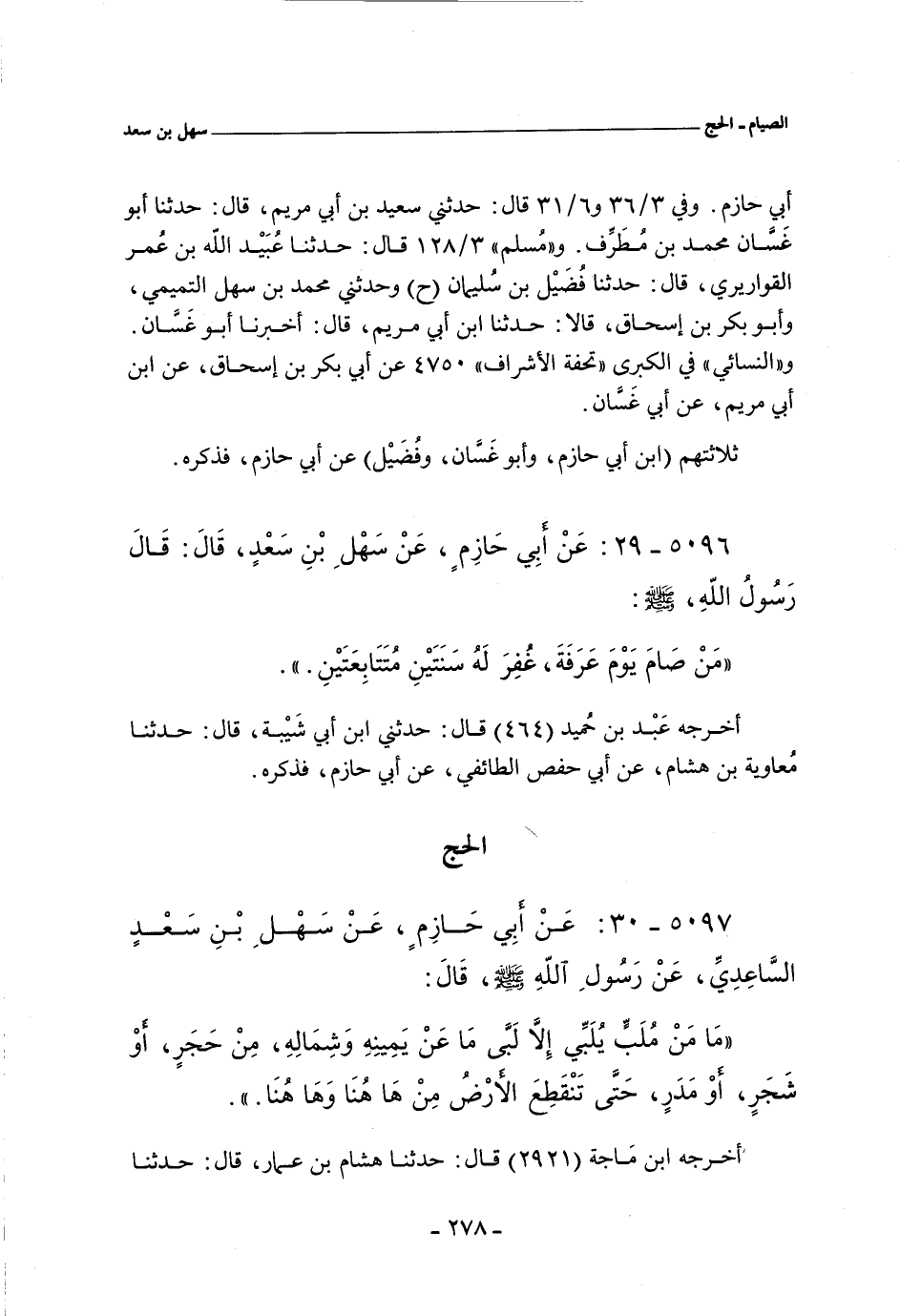 أَبي حازم. وفي ٣/ ٣٦ (١٩١٧) و ٦/ ٣١ (٤٥١١) قال: حدَّثني سعيد بن أَبي مريم، حدثنا أبو غَسان محمد بن مُطَرِّف. و"مسلم" ٣/ ١٢٨ (٢٥٠١) قال: حدثنا عُبَيْد الله بن عُمر القواريري، حدثنا فُضَيل بن سُليمان. وفي ٣/ ١٢٨ (٢٥٠٢) قال: حدَّثني محمد بن سَهل التَّميمي، وأبو بكر بن إسحاق , قالا: حدثنا ابن أَبي مَريم، أخبرنا أبو غَسَّان (النسائي) في "الكبرى" ١٠٩٥٥ قال: أخبرنا أبو بكر بن إسحاق، حدثنا سَعِيد بن أَبي مَريم، أخبرنا أبو غَسان.