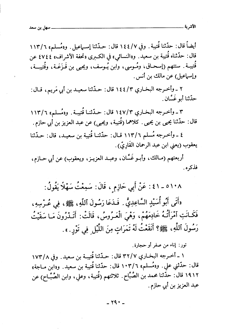 قال: حدثنا قُتَيْبَة، عن مالك. وفي ٧/ ١٤٤ (٥٦٢٠) قال: حدثنا إسماعيل , قال: حدَّثني مالك. و"مسلم" ٦/ ١١٣ (٥٣٤٥) قال: حدثنا قُتَيْبَة بن سعيد، عن مالك بن أنس، فيما قُرئَ عليه. وفي ٦/ ١١٣ (٥٣٤١) قال: حدثنا يحيى بن يحيى، أخبرنا عبد العزيز بن أَبي حازم (ح) وحدثنا هـ قُتيبة بن سعيد، حدثنا يعقوب، يعني ابن عبد الرحمن الفارِي. و"النَّسَائي" في "الكبرى" ٦٨٣٩ قال: أخبرنا قُتيبة بن سعيد، عن مالك.