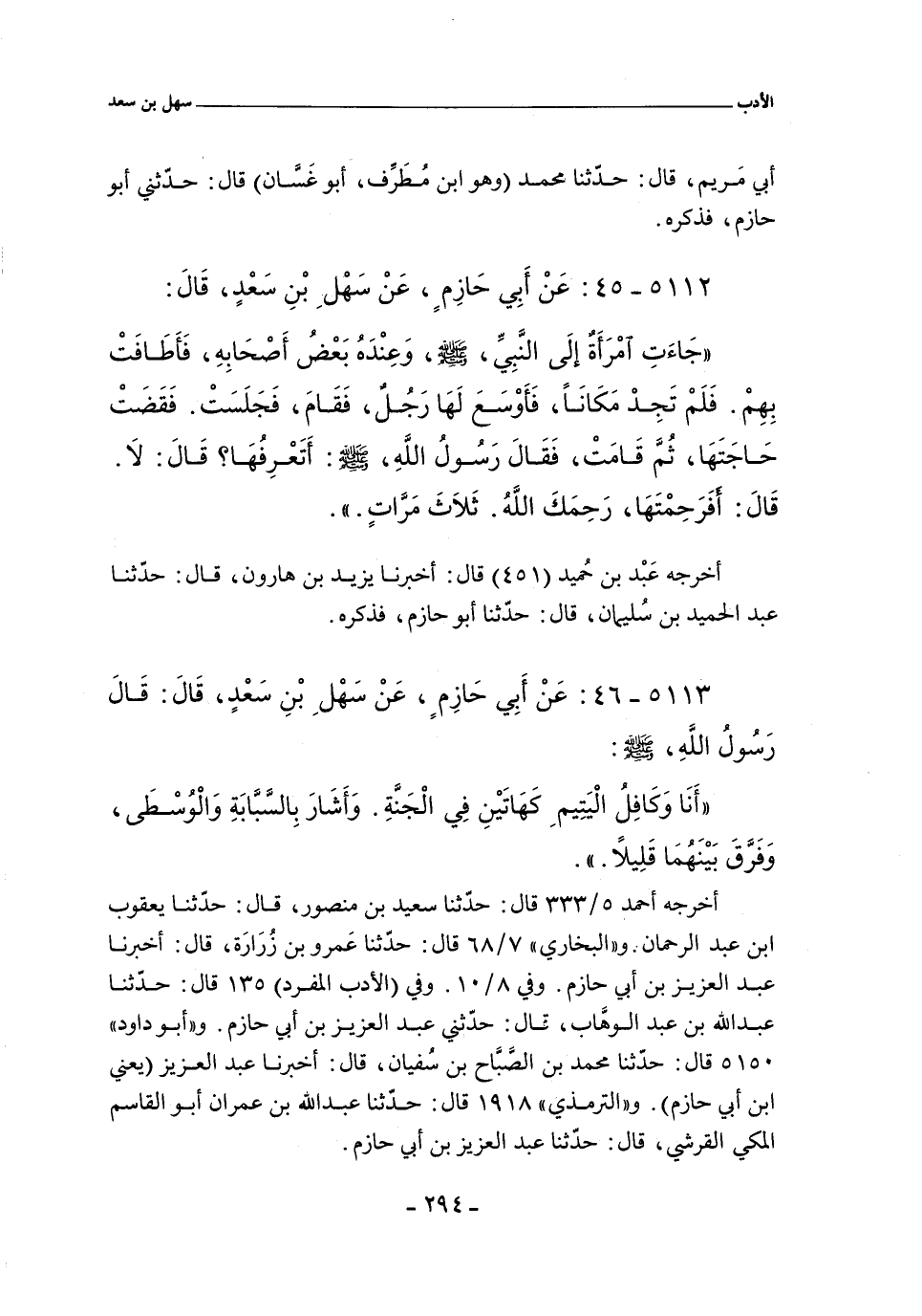 ٥١١٣ - عَنْ أَبِى حَازِمٍ , عَنْ سَهْلِ بْنِ سَعْدٍ , قَالَ: قَالَ رَسُولُ الله , صلى الله عليه وسلم: