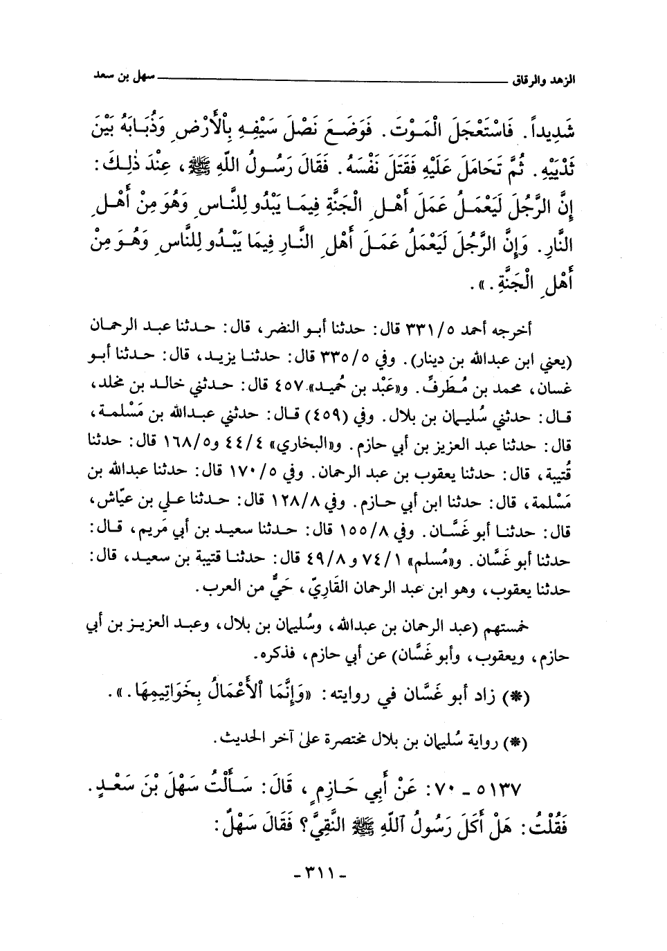 خمستهم (عبد الرحمن بن عبد الله، وأبو غَسَّان، وسُليمان بن بلال، وعبد العزيز بن أَبي حازم، ويعقوب) عن أَبي حازم، فذكره.