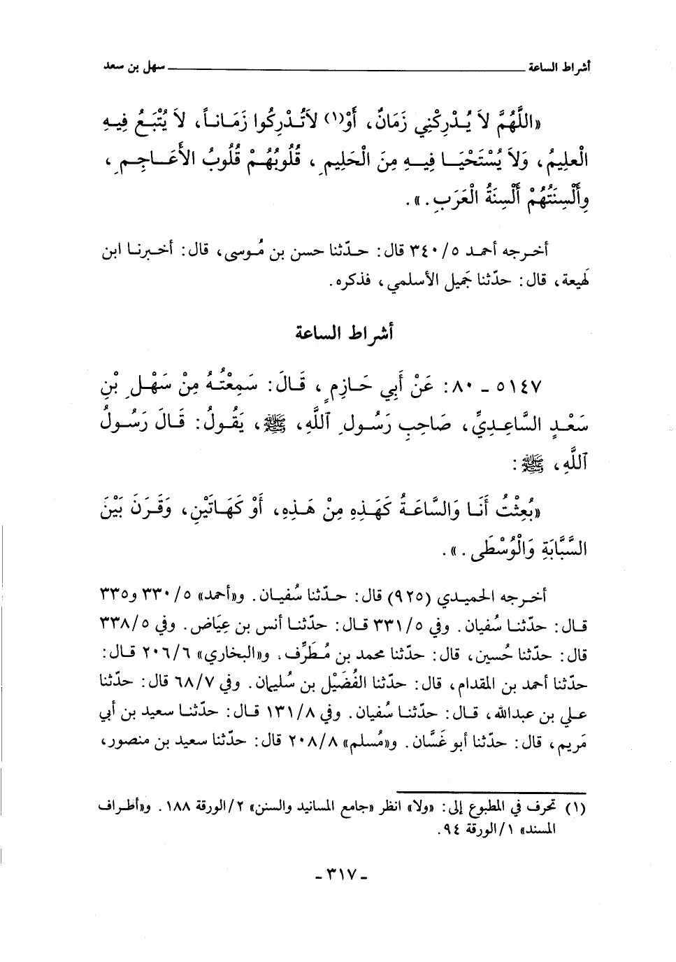 ٥١٤٧ - عن أبي حَازِمٍ , قال: سَمِعْتُهُ مِنْ سَهْلِ بْنِ سَعْدٍ السَّاعِدِيِ , صَاحِبِ رَسُولِ الله صلى الله عليه وسلم , يَقُولُ: قَالَ رَسُولُ الله صلى الله عليه وسلم: