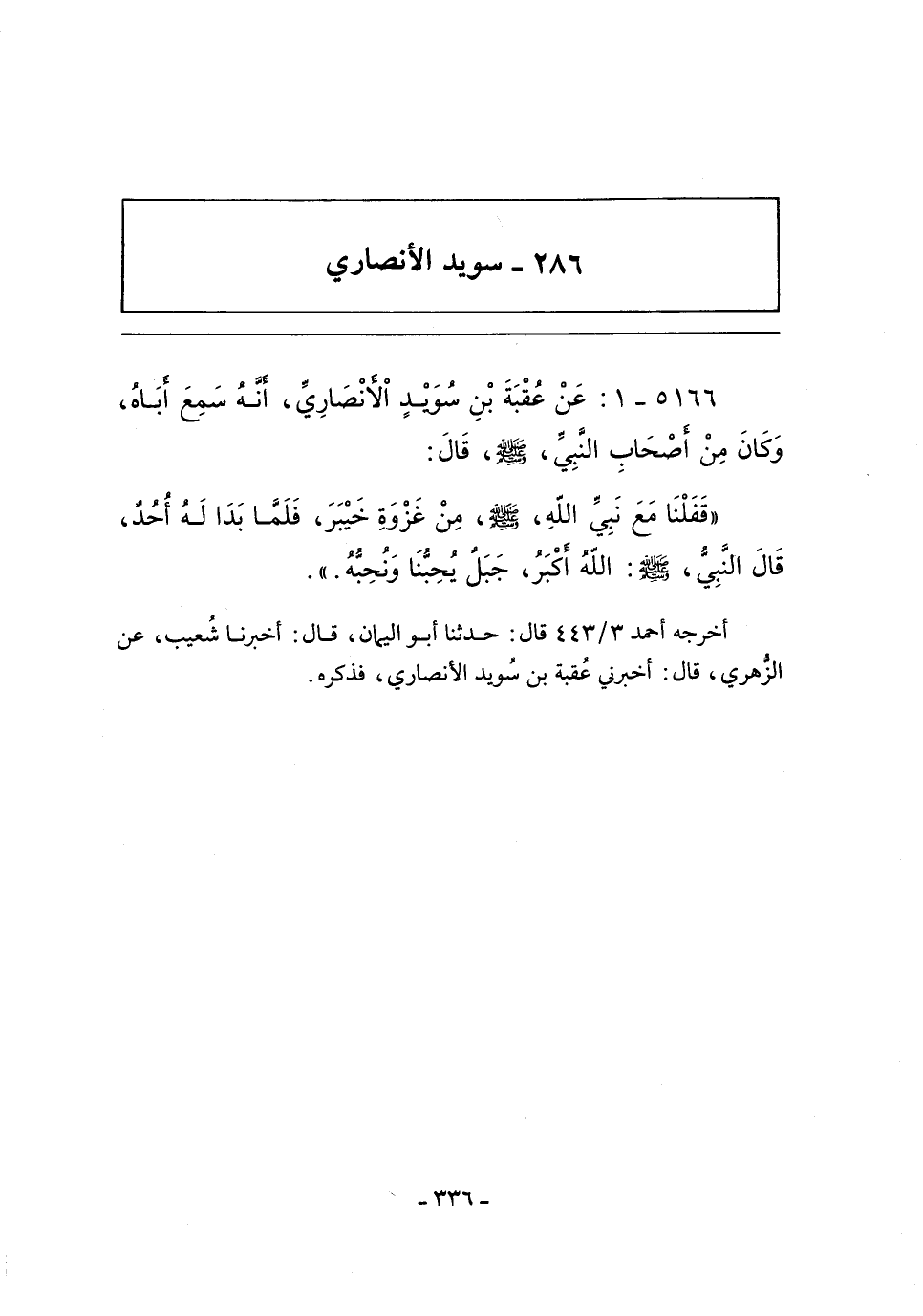 قَفَلْنَا مع نَبِيِّ الله , صلى الله عليه وسلم , مِنْ غَزْوَةِ خَيْبَرَ , فَلَمَّا بَدَا لَهُ أُحُدٌ , قَالَ النَّبِيّ, صلى الله عليه وسلم: الله أَكْبَرُ , جَبَلٌ يُحِبُّنَا وَنُحِبُّهُ.