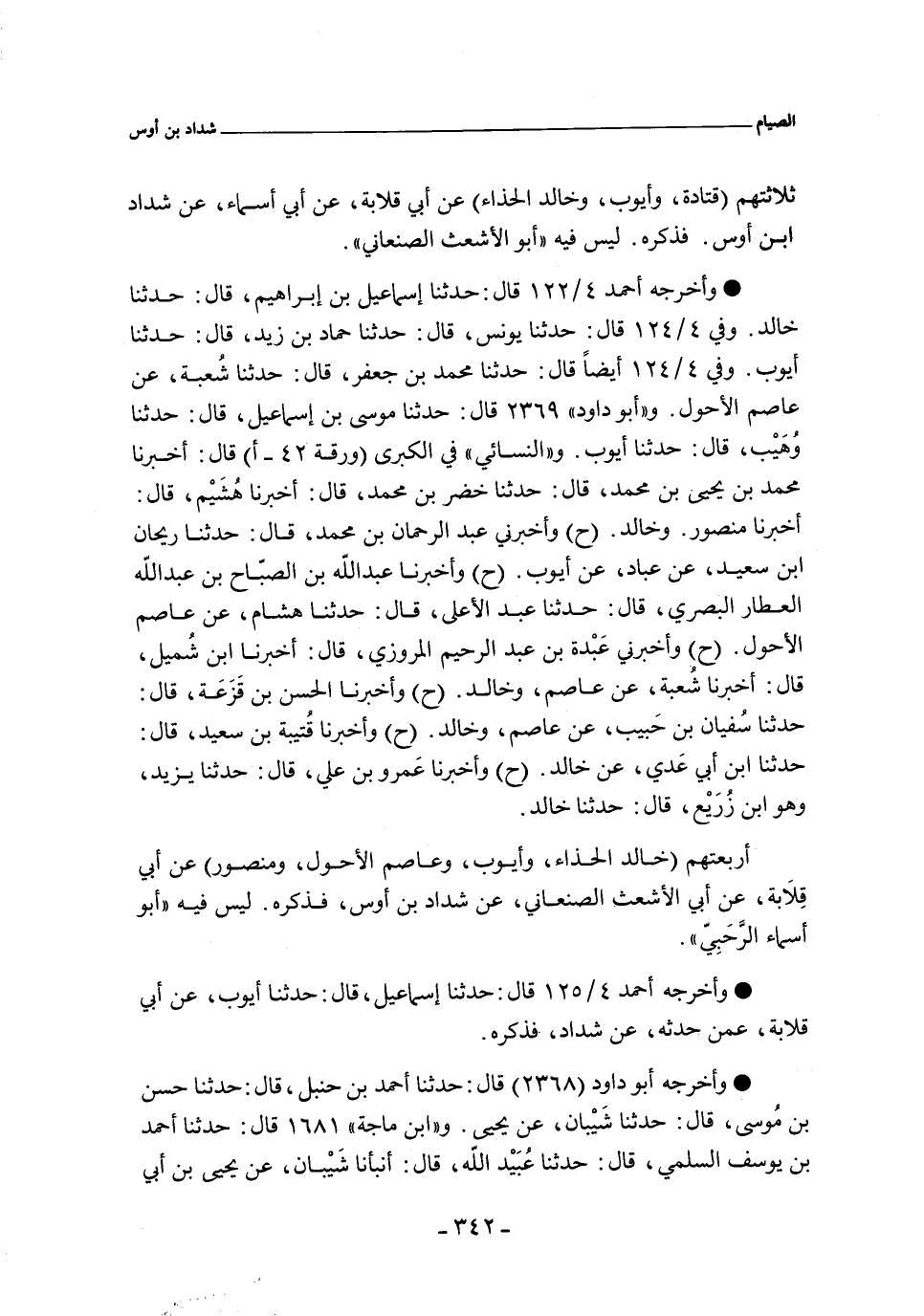 أربعتهم (خالد الحذاء، وأيوب، وعاصم بن سُليمان الأحول، ومنصور) عن أَبي قِلَابة، عن أَبي الأشعث الصنعاني، عن شداد بن أوس، فذكره. ليس فيه (أبو أسماء الرحَبِي.