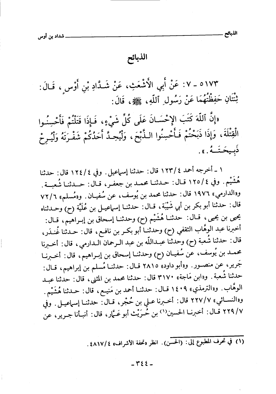٥١٧٣ - عن أبي الأشعث , عن شداد بن أوس , قال: ثنتان حفظتهما عن رسول الله صلى الله عليه وسلم , قال: