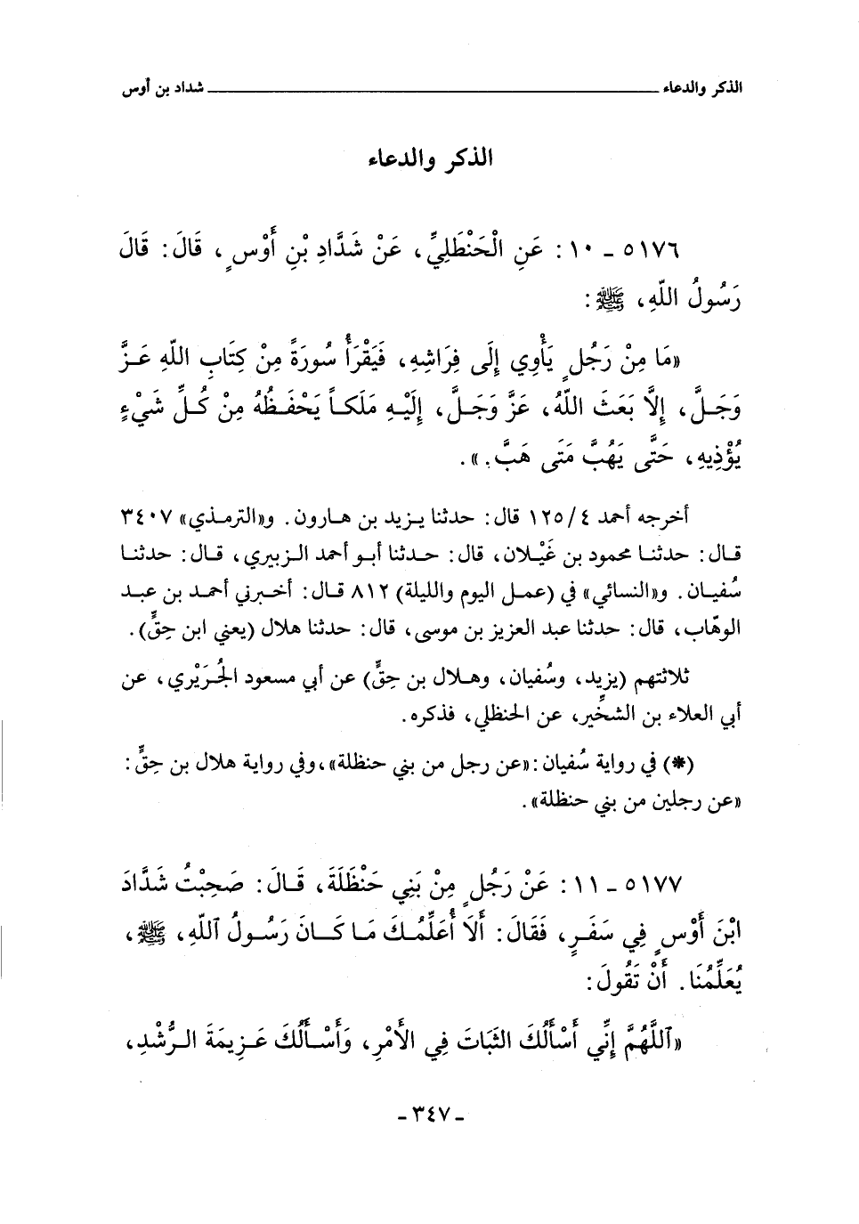 قَالَ: وَكَانَ رَسُولُ الله صلى الله عليه وسلم يُعَلِّمُنَا كَلِمَاتٍ , نَدْعُو بِهِنَّ فِى صَلَاتِنَا - أَوْ قَالَ: فِى دُبُرِ صَلَاتِنَا: اللهمَّ إِنِّى أَسْأَلُكَ الثَّبَاتَ فِى الأَمْرِ , وَأَسْأَلُكَ عَزِيمَةَ الرُّشْدِ ,