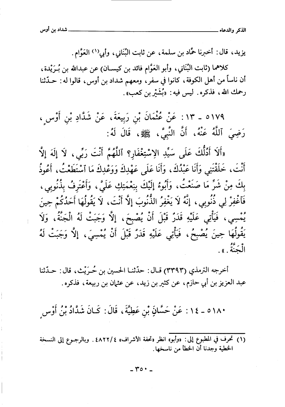 ٥١٧٩ - عن عثمان بن رَبِيعَةَ , عَنْ شَدَّادِ بْنِ أَوْسٍ , رَضِىَ الله عَنْهُ , أَنَّ النَّبيَّ صلى الله عليه وسلم , قَالَ لَهُ:
