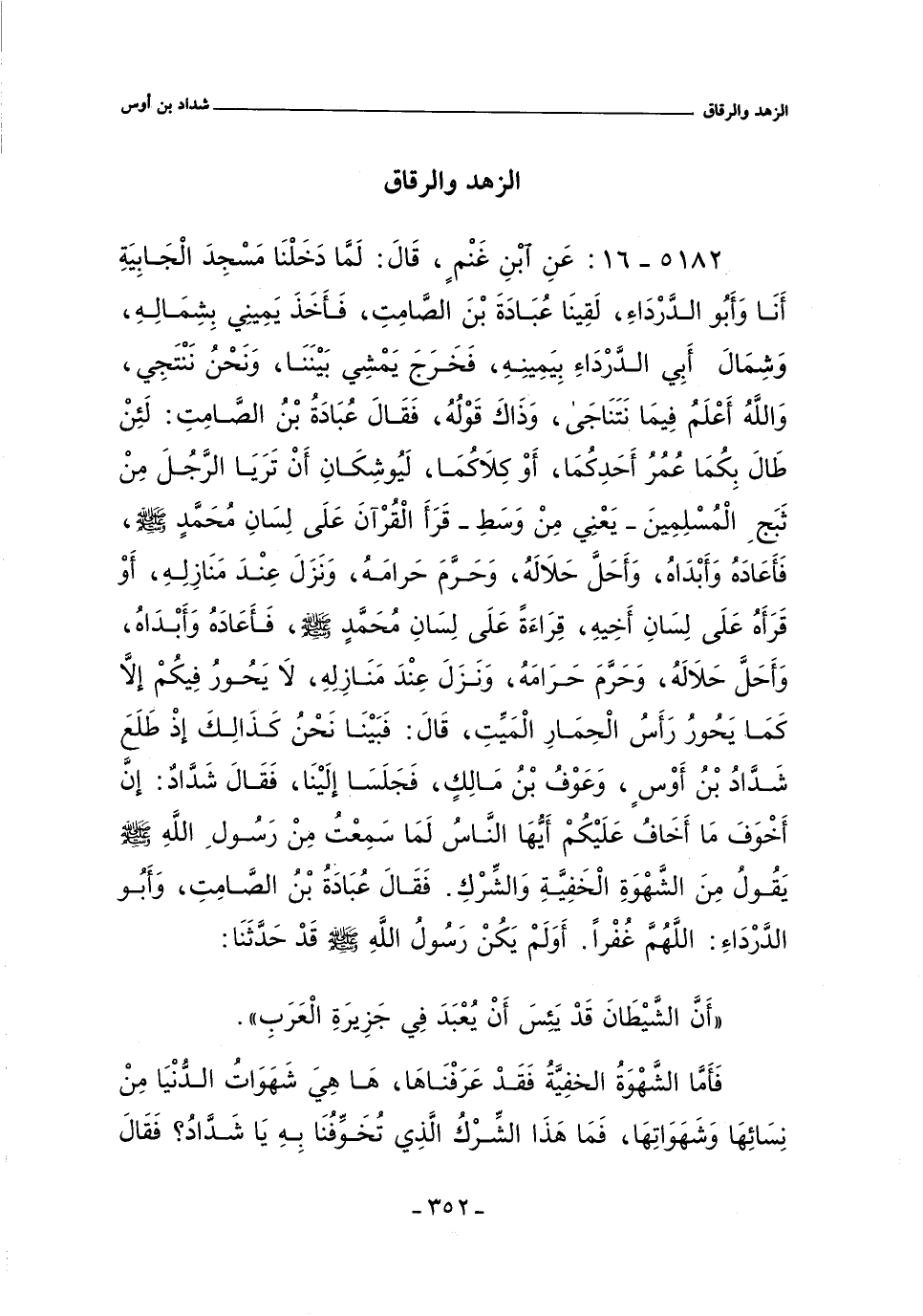 ٥١٨٢ - عَنِ ابْنِ غَنْمٍ , قال: لَمَّا دَخَلْنَا مَسْجِدَ الْجَابِيَةِ أَنَا وَأَبُو الدَّرْدَاءِ لَقِينَا عُبَادَةَ بْنَ الصَّامِتِ فَأَخَذَ يَمِينِى بِشِمَالِهِ وَشِمَالَ أَبِى الدَّرْدَاءِ بِيَمِينِهِ فَخَرَجَ يَمْشِى بَيْنَنَا وَنَحْنُ نَنْتَجِى وَالله أَعْلَمُ فِيمَا نَتَنَاجَى وَذَاكَ قَوْلُهُ فَقَالَ عُبَادَةُ بْنُ الصَّامِتِ لَئِنْ طَالَ بِكُمَا عُمْرُ أَحَدِكُمَا أَوْ كِلَاكُمَا لَيُوشِكَانِ أَنْ تَرَيَا الرَّجُلَ مِنْ ثَبَجِ الْمُسْلِمِينَ يَعْنِى مِنْ وَسَطٍ قَرَأَ الْقُرْآنَ عَلَى لِسَانِ مُحَمَّدٍ صلى الله عليه وسلم , فَأَعَادَهُ وَأَبْدَاهُ وَأَحَلَّ حَلَالَهُ وَحَرَّمَ حَرَامَهُ وَنَزَلَ عِنْدَ مَنَازِلِهِ أَوْ قَرَأَهُ عَلَى لِسَانِ أَخِيهِ قِرَاءَةً عَلَى لِسَانِ مُحَمَّدٍ صلى الله عليه وسلم فَأَعَادَهُ وَأَبْدَاهُ وَأَحَلَّ حَلَالَهُ وَحَرَّمَ حَرَامَهُ وَنَزَلَ عِنْدَ مَنَازِلِهِ لَا يَحُورُ فِيكُمْ إِلَاّ كَمَا يَحُورُ رَأْسُ الْحِمَارِ الْمَيِّتِ قَالَ فَبَيْنَا نَحْنُ كَذَلِكَ إِذْ طَلَعَ شَدَّادُ بْنُ أَوْسٍ وَعَوْفُ بْنُ مَالِكٍ فَجَلَسَا إِلَيْنَا فَقَالَ شَدَّادٌ إِنَّ أَخْوَفَ مَا أَخَافُ عَلَيْكُمْ أَيُّهَا النَّاسُ لَمَا سَمِعْتُ مِنْ رَسُولِ الله صلى الله عليه وسلم يَقُولُ مِنَ الشَّهْوَةِ الْخَفِيَّةِ وَالشِّرْكِ فَقَالَ عُبَادَةُ بْنُ الصَّامِتِ وَأَبُو الدَّرْدَاءِ اللهمَّ غُفْرًا أَوَلَمْ يَكُنْ رَسُولُ الله صلى الله عليه وسلم قَدْ حَدَّثَنَا: