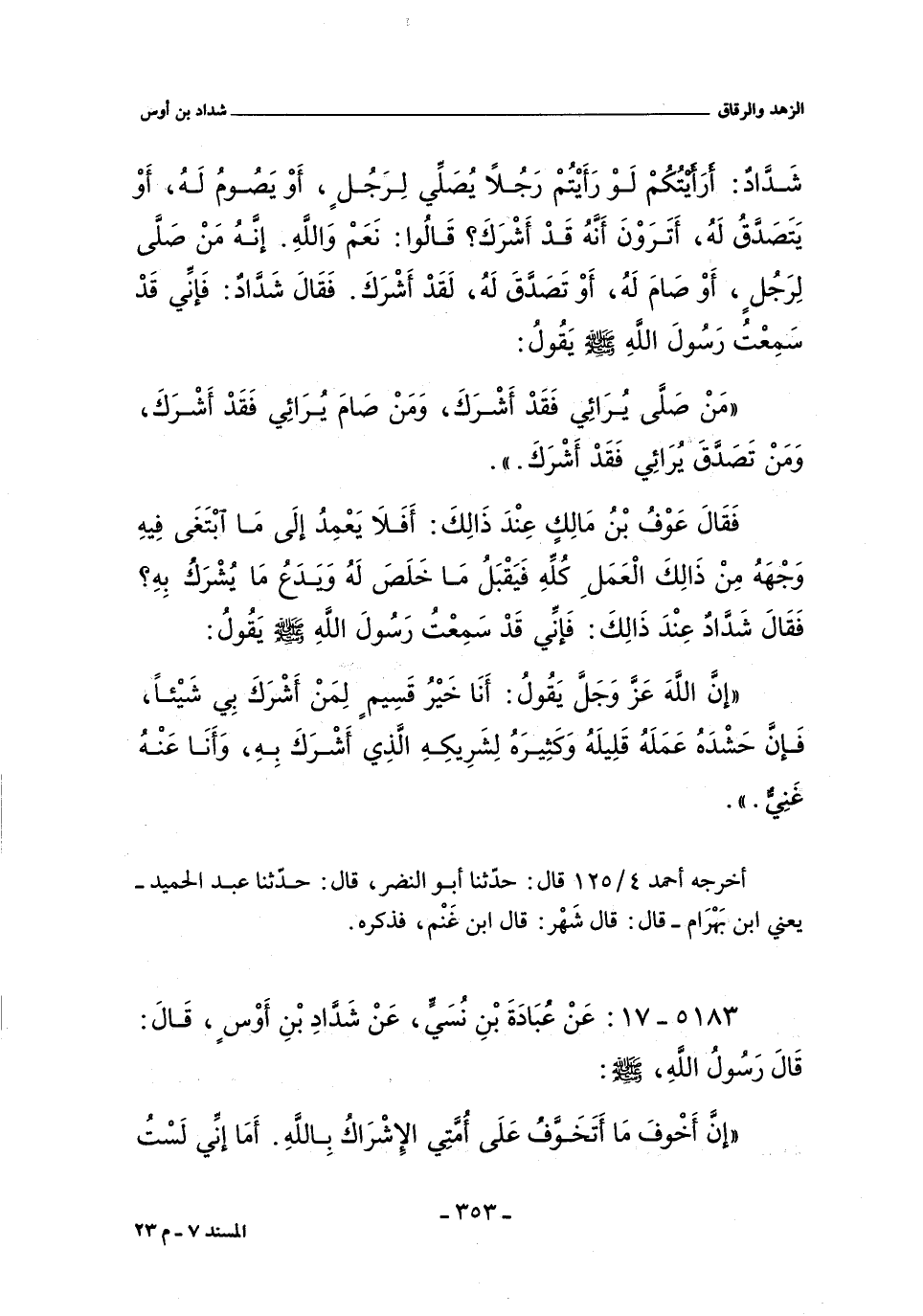 شَدَّادٌ أَرَأَيْتُكُمْ لَوْ رَأَيْتُمْ رَجُلاً يُصَلِّى لِرَجُلٍ أَوْ يَصُومُ لَهُ أَوْ يَتَصَدَّقُ لَهُ أَتَرَوْنَ أَنَّهُ قَدْ أَشْرَكَ قَالُوا نَعَمْ وَالله إِنَّهُ مَنْ صَلَّى لِرَجُلٍ أَوْ صَامَ لَهُ أَوْ تَصَدَّقَ لَهُ لَقَدْ أَشْرَكَ فَقَالَ شَدَّادٌ فَإِنِّى قَدْ سَمِعْتُ رَسُولَ الله صلى الله عليه وسلم يَقُولُ:
