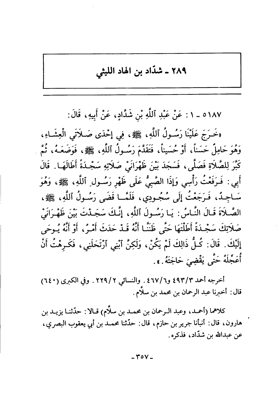 خرج علينا رسول الله , صلى الله عليه وسلم , في إحدى صلاتي العشاء , وهو حامل حسنا , أو حسنيا , فتقدم لرسول الله , صلى الله عليه وسلم , فوضعه , ثم كبر للصلاة فصلى , فسجد بين ظهرني صلاته سجدة أطالها. قال أبي: فرفعت رأسي وإذا الصبي على ظهر رسول الله , صلى الله عليه وسلم , وهو ساجد , فرجعت إلى سجودي , فلما قضى رسول الله , صلى الله عليه وسلم , الصلاة. قال الناس: يا رسول الله , إنك سجدت بين ظهرني صلاتك سجدة أطلتها حتى ظننا أنه قد حدث أمر , أو أنه يوحى إليك. قال: كل ذلك لم يكن , ولكن ابني ارتحلني , فكرهت أن أعجله حتى يقضي حاجته.
