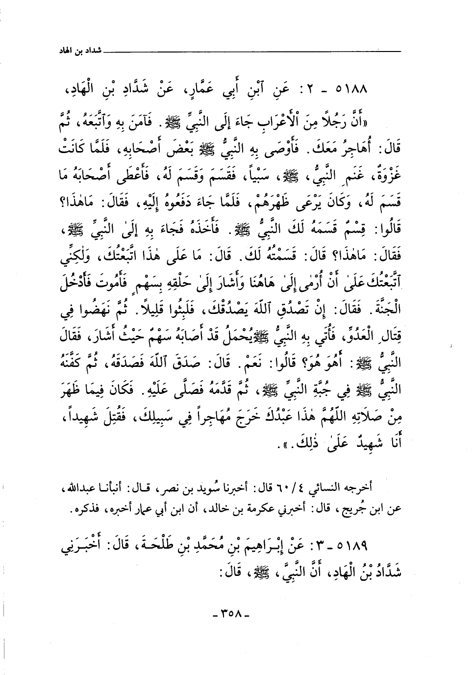 أَن رَجُلَا مِنَ الأَعْرَابِ جَاءَ إِلى النبِي، صلى الله عليه وسلم، فَامَنَ بِهِ وَآتبَعَهُ، ُثم قَالَ: أُهَاجِرُ مَعَكَ، فَأَوْصَى بِهِ النبِيُّ، صلى الله عليه وسلم، بَعضَ أَصحَابِهِ، فَلما كَانَت غَزوَة، غَنَمِ النبِيُّ، صلى الله عليه وسلم، سَبيًا، فَقَسَمَ وَقَسَمَ لَهُ، فَاَعْطَى أَصحَابَهُ مَا قَسَمَ لَهُ، وَكَانَ يَرعَى ظَهرَهُم، فَلَمُّا جَاءَ دَفَعُوهُ إِلَيهِ، فَقَالَ: مَا هَذَا قَالُوا: قِسم قَسَمَهُ لَكَ اَلنبِي، صلى الله عليه وسلم، فَأَخَذَهُ فَجَاءَ بهِ إِلى اَلنبِي، صلى الله عليه وسلم، فَقَالَ: مَا هَذَا قَالَ: قَسَمتُهُ لَكَ. قَالَ: مَا على هَذَا اتبَعْتُكَ، وَلَكِني اتبعْتُكَ على أن أُرمى إِلَى هَاهُنَا، وَأَشَارَ إِلَى حَلقِهِ، بسَهم فَاَمُوتَ فَاَدخُلَ الْجَنةَ. فَقَالَ: إِن تَصْدُقِ الله يَصْدُقْكَ، فَلَبِثُوا قَلِيلآ، ثُم نَهَضُوا فِي قِتَالِ الْعَدُؤ، فَاُتَي بِهِ النبِي، صلى الله عليه وسلم يُحمَلُ قَد أَصَابَهُ سَهْئم حَيثُ أَشَار َ، فَقَالَ النبي , صلى الله عليه وسلم: أَهُوَ هُوَ قَالُوا: نَعم. قَالَ: صَدَقَ الله فَصَدَقَهُ، ثُم كَفنَهُ اَلنبِي، صلى الله عليه وسلم، فِي جُبًةِ اَلنبِي، صلى الله عليه وسلم، ثُمَّ قدمَهُ فَصَلى عَلَيهِ، فَكَانَ فِيمَا ظَهَرَ مِن صَلَاتِهِ؛ أللًهُم هَذَا عَبْدُكَ، خَرَجَ مُهَاجِرا فِي سَبيلِكَ، فَقُتِلَ شَهِيداَ، أَنَا شَهِيد على ذَلِكَ.