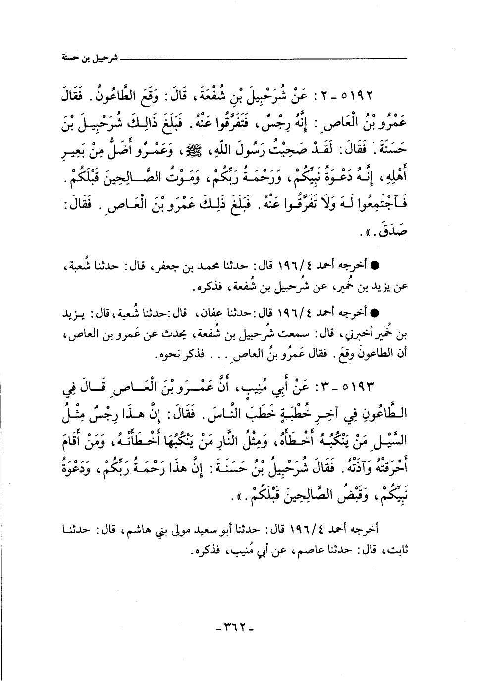 (*) اللفظ لمحمد بن جعفر، ولفظد عفان، وابن كثير: عن شرحبيل بن شفعة، عن عَمرو بن العاص، اْن الطاعون وقع - وعند ابن كثير: أن الطاعون وقع بالشام -. الحديث.
