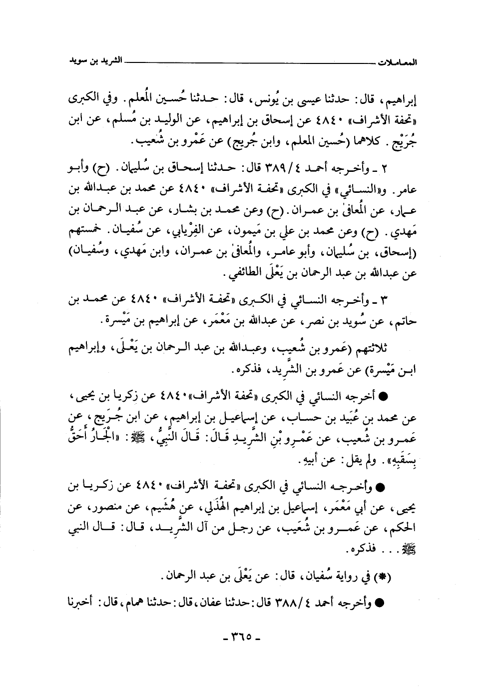 إبراهيم , قال: حدثنا عيسى بن يونس , قال: حدثنا حُسين المُعلم، عن عَمرو بن شُعيب. وفي "الكبرى" ١١٧١٩ عن محمد بن عبد الله بن عمار، عن المُعافن بن عِقران، عن عبد الله بن عبد الرحمن بن يَعلى. وفي (١١٧٢٠) عن محمد بن بشار، عن عبد الرحمن بن مهدي , عن عبد الله بن عبد الرحمن بن يعلى. وفي (١١٧٢٠) عن محمد بن علي بن مَيمون، عن الفريابي، عن سفيان، عن يَعلى بن عبد الرحمن. وفي (١١٧٢٢) عن محمد بن حاتم، عن سُويد بن نصر، عن عبد الله بن معمر، عن إبراهيم بن ميسرة. وفي (١١٧٢٣) عن إسحاق بن إبراهيم، عن الوليد بن مسلم، عن ابن جُريج، عن عَمرو بن شُعيب.