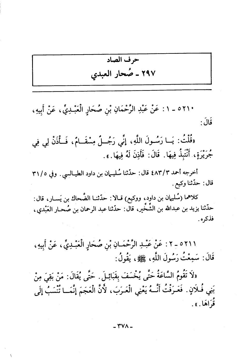 ٥٢١٠ - عَنْ عَبْدِ الرحمن بْنِ صُحَارٍ الْعَبْديِّ، عَنْ أَبِيهِ، قَالَ: