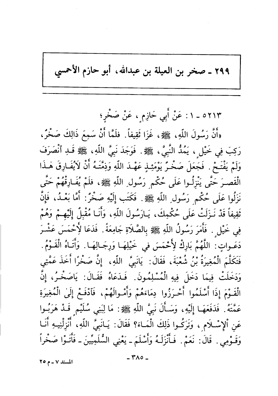 أَنَّ رَسُولَ الله صلى الله عليه وسلم، غَزَا ثَقِِيفًا، فَلَمَّا أَنْ سَمِعَ ذَلِكَ صَخْرٌ، رَكِبَ فِي خَيْلٍ، يُمِدُّ النَّبِيَّ، صلى الله عليه وسلم. فَوَجَدَ نَبِيَّ الله صلى الله عليه وسلم قَدِ انْصَرَفَ وَلَمْ يَفْتَحْ، فَجَعَلَ صَخْرٌ يَوْمَئِذٍ عَهْدَ الله وَذِمَّتَهُ أَنْ لَا يُفَارِقَ هَذَا الْقَصْرَ حَتَّى يَنْزِلُوا عَلَى حُكْمِ رَسُولِ الله صلى الله عليه وسلم، فَلَمْ يُفَارِقْهُمْ حَتَّى نَزَلُوا عَلَى حُكْمِ رَسُولِ الله صلى الله عليه وسلم. فَكَتَبَ إِلَيْهِ صَخْرٌ: أَمَّا بَعْدُ، فَإِنَّ ثَقِيفًا قَدْ نَزَلَتْ عَلَى حَكْمِكَ، يَا رَسُولَ الله، وَأَنَا مُقْبِلٌ إِلَيْهِمْ وَهُمْ فِي خَيْلٍ، فَأَمَرَ رَسُولُ الله صلى الله عليه وسلم، بِالصَّلَاةِ جَامِعَةً، فَََدَعَا لأَحْمَسَ عَشْرَ دَعَوَاتٍ: اللهمَّ بَارِكْ لأَحْمَسَ فِي خَيْلَهَا وَرِجَالِهَا، وَأَتَاهُ الْقَوْمُ، فَتَكَلَّمَ الْمُغِيرَةُ بْنُ شُعْبَةَ، فَقَالَ: يَا نَبِيَّ الله، إِنَّ صَخْرًا أَخَذَ عَمََّتِي، وَدَخَلَتْ فِيمَا دَخَلَ فِيهِ الْمُسْلِمُونَ، فَدَعَاهُ فَقَالَ: يَا صَخْرُ، إِنَّ الْقَوْمَ إِذَا أَسْلَمُوا أَحْرَزُوا دِمَاءَهُمْ وَأَمْوَالَهُمْ، فَادْفَعْ إِلَى الْمُغِيرَةَ عَمَّتَهُ، فَدَفَعَهَا إِلَيْهِ، وَسَأَلَ نَبِيَّ الله مَاءً لِبَنِي سُلَيْمٍ، قَدْ هَرَبُوا عَنْ الإِسْلَامِ، وَتَرَكُوا ذَلِكَ الْمَاءَ؟ فَقَالَ: يَا نَبِيَّ الله، أَنْزِلْنِيهِ أَنَا وَقَوْمِي. قَالَ: نَعَمْ، فَأَنْزَلَهُ وَأَسْلَمَ - يَعْنِي السُّلَمِيِّينَ - فَأَتَوْا صَخْرًا،