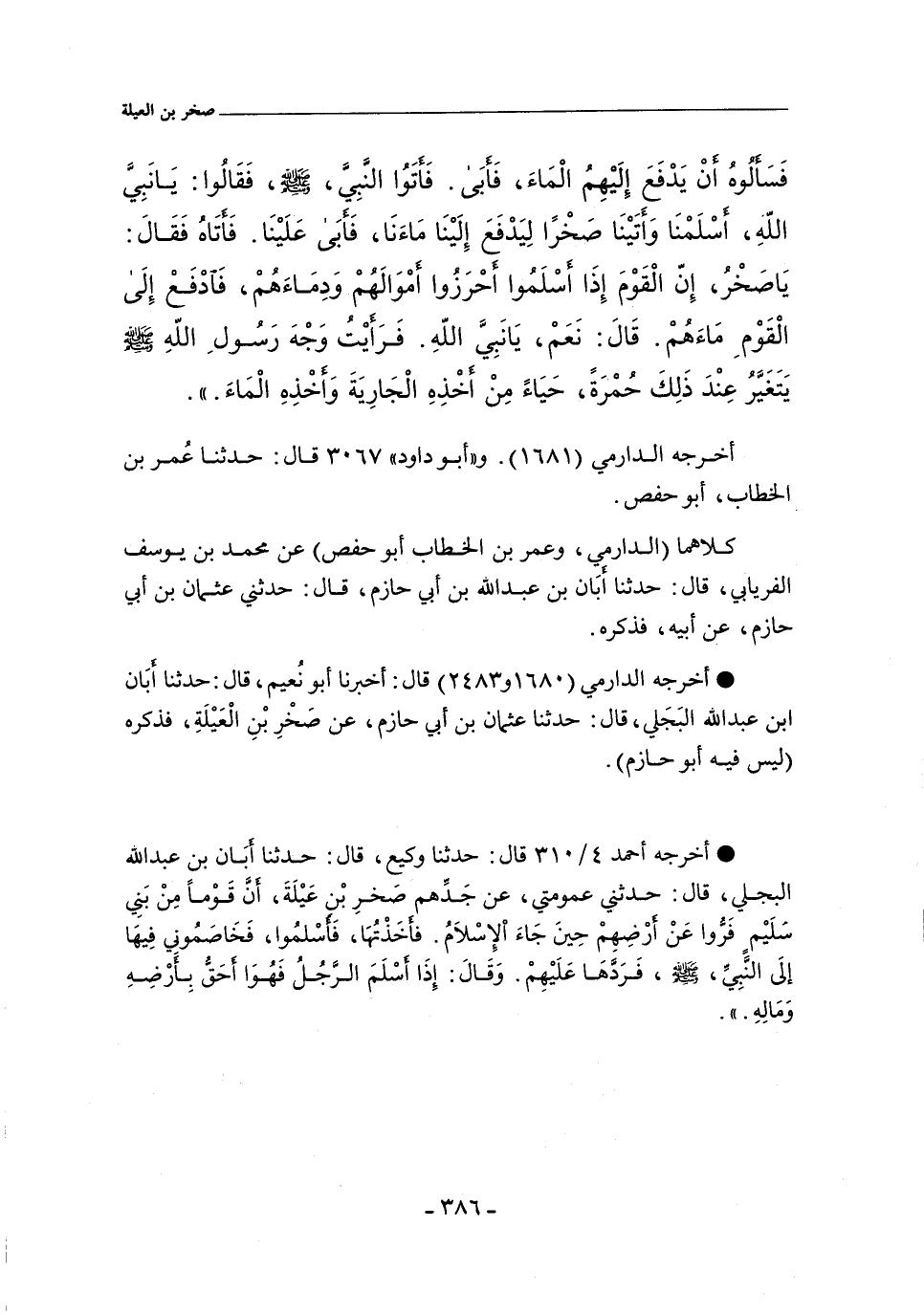 - أخرجه أحمد ٤/ ٣١٠ (١٨٩٨٥) قال: حدّثنا وكيع، حدّثنا أَبَان بن عبد الله البَجَلي، حدثني عُمومتي، عن جَدِّهم صَخْر ِبْن عَيْلَةَ؛ أَنَّ قَوْمًا مِن بَنِي سُلَيْمٍ فَرَّوا عَنْ أَرْضِهِمْ حِينَ جَاءَ الإِسْلَامُ، فَأَخَذْتُهَا، فَأَسْلَمُوا، فَخَاصَمُونِي فِيهَا إِلَى النَّبِِيِّ، صلى الله عليه وسلم، فَرَدَّهَا عَلَيْهِمْ. وَقَالَ: إِذَا أَسْلَمَ الرَّجُلُ فَهُوَ أَحَقُّ بِأَرْضِهِ وَمَالِهِ (.