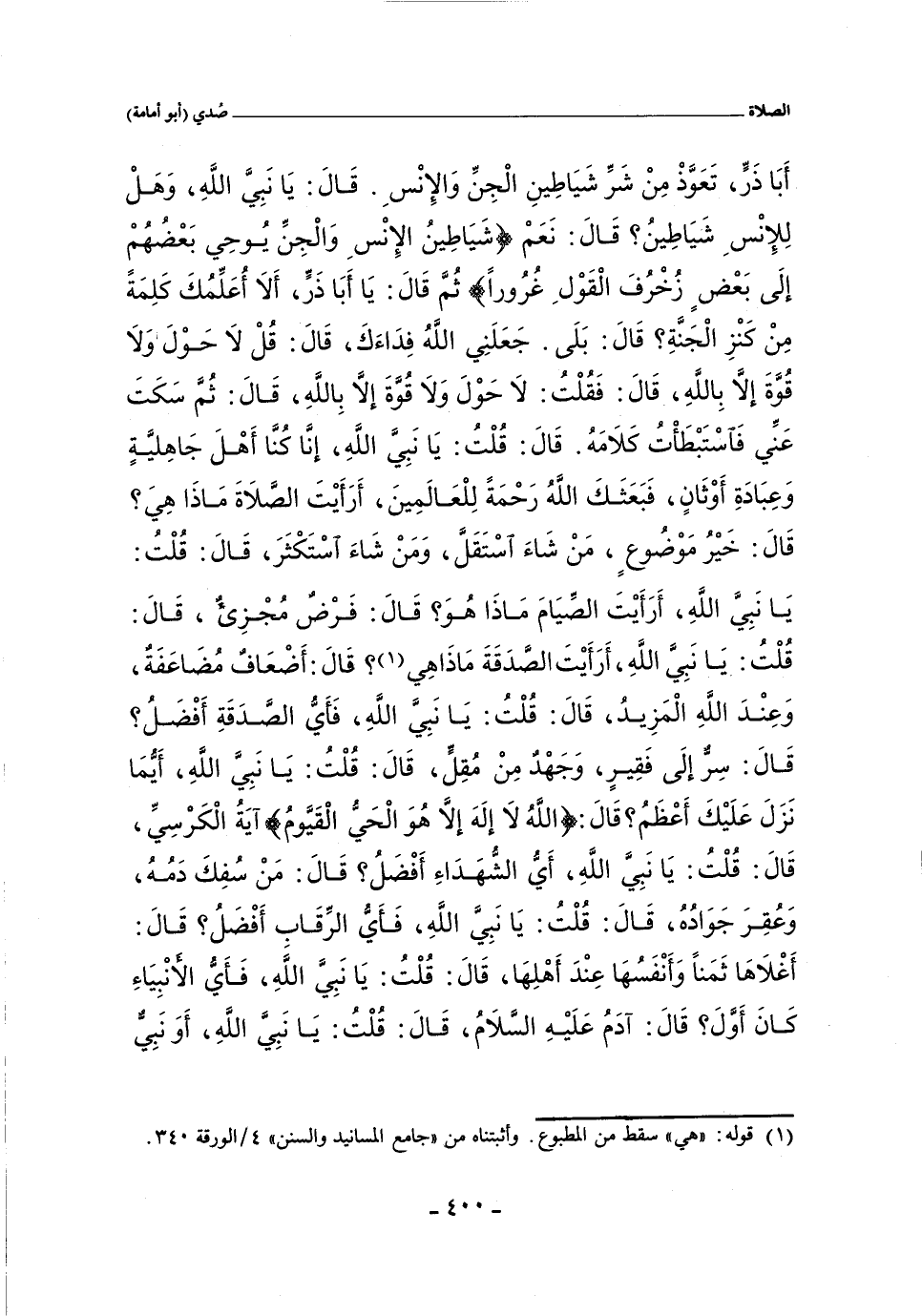 أَبَا ذَرٍّ، تَعَوَّذْ بِاللهِ مِنْ شَرِّ شَيَاطِينِ الْجِنِّ وَالإِنْسِ، قَالَ: يَا نَبِيَّ اللهِ، وَهَلْ لِلإِنْسِ شَيَاطِينُ؟ قَالَ: نَعَمْ (شَيَاطِينُ الإِنْسِ وَالْجِنِّ يُوحِى بَعْضُهُمْ إِلَى بَعْضٍ زُخْرُفَ الْقَوْلِ غُرُورًا) ثُمَّ قَالَ: يَا أَبَا ذَرٍّ، أَلَا أُعَلِّمُكَ كَلِمَةً مِنْ كَنْزِ الْجَنَّةِ؟ قَالَ: بَلَى، جَعَلَنِي اللهُ فِدَاكَ، قَالَ: قُلْ: لَا حَوْلَ وَلَا قُوَّةَ إِلَاّ بِاللهِ، قَالَ: فَقُلْتُ: لَا حَوْلَ وَلَا قُوَّةَ إِلَاّ بِاللهِ , قَالَ: ثُمَّ سَكَتَ عَنِّي فَاسْتَبْطَأْتُ كَلَامَهُ، قَالَ: قُلْتُ: يَا نَبِيَّ اللهِ، إِنَّا كُنَّا أَهْلَ جَاهِلِيَّةٍ وَعِبَادَةَ أَوْثَانٍ، فَبَعَثَكَ اللهُ رَحْمَةً لِلْعَالَمِينَ، أَرَأَيْتَ الصَّلَاةَ مَاذَا هِيَ؟ قَالَ: خَيْرٌ مَوْضُوعٌ، مَنْ شَاءَ اسْتَقَلَّ، وَمَنْ شَاءَ اسْتَكْثَرَ , قَالَ: قُلْتُ: يَا نَبِيَّ اللهِ، أَرَأَيْتَ الصِّيَامَ مَاذَا هُوَ؟ قَالَ: فَرْضٌ مُجْزِئٌ , قَالَ: قُلْتُ: يَا نَبِيَّ اللهِ، أَرَأَيْتَ الصَّدَقَةَ مَاذَا هِيَ؟ قَالَ: أَضْعَافٌ مُضَاعَفَةٌ، وَعِنْدَ اللهِ الْمَزِيدُ , قَالَ: قُلْتُ: يَا نَبِيَّ اللهِ، فَأَىُّ الصَّدَقَةِ أَفْضَلُ