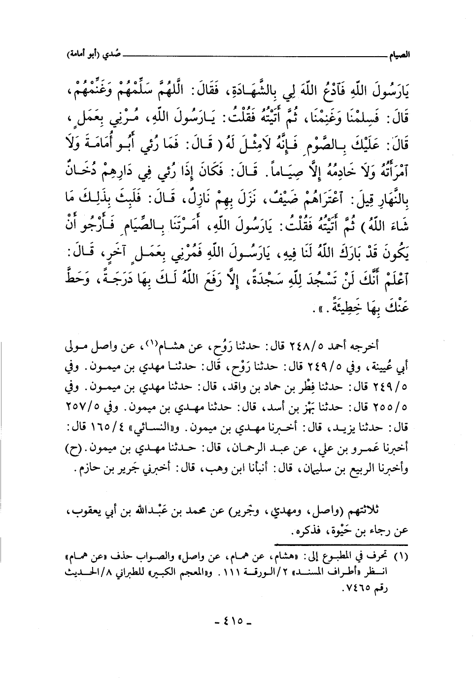 يَا رَسُولَ اللَّهِ فَادْعُ اللَّهَ لِى بِالشَّهَادَةِ فَقَالَ اللَّهُمَّ سَلِّمْهُمْ وَغَنِّمْهُمْ قَالَ فَسَلِمْنَا وَغَنِمْنَا ثُمَّ أَتَيْتُهُ فَقُلْتُ يَا رَسُولَ اللَّهِ مُرْنِى بِعَمَلٍ قَالَ عَلَيْكَ بِالصَّوْمِ فَإِنَّهُ لَا مِثْلَ لَهُ قَالَ فَمَا رُئِىَ أَبُو أُمَامَةَ وَلَا امْرَأَتُهُ وَلَا خَادِمُهُ إِلَاّ صُيَّامًا قَالَ فَكَانَ إِذَا رُئِىَ فِى دَارِهِمْ دُخَانٌ بِالنَّهَارِ قِيلَ اعْتَرَاهُمْ ضَيْفٌ نَزَلَ بِهِمْ نَازِلٌ قَالَ فَلَبِثَ بِذَلِكَ مَا شَاءَ اللَّهُ ثُمَّ أَتَيْتُهُ فَقُلْتُ يَا رَسُولَ اللَّهِ أَمَرْتَنَا بِالصِّيَامِ فَأَرْجُو أَنْ يَكُونَ قَدْ بَارَكَ اللَّهُ لَنَا فِيهِ يَا رَسُولَ اللَّهِ فَمُرْنِى بِعَمَلٍ آخَرَ قَالَ اعْلَمْ أَنَّكَ لَنْ تَسْجُدَ لِلَّهِ سَجْدَةً إِلَاّ رَفَعَ اللَّهُ لَكَ بِهَا دَرَجَةً وَحَطَّ عَنْكَ بِهَا خَطِيئَةً.