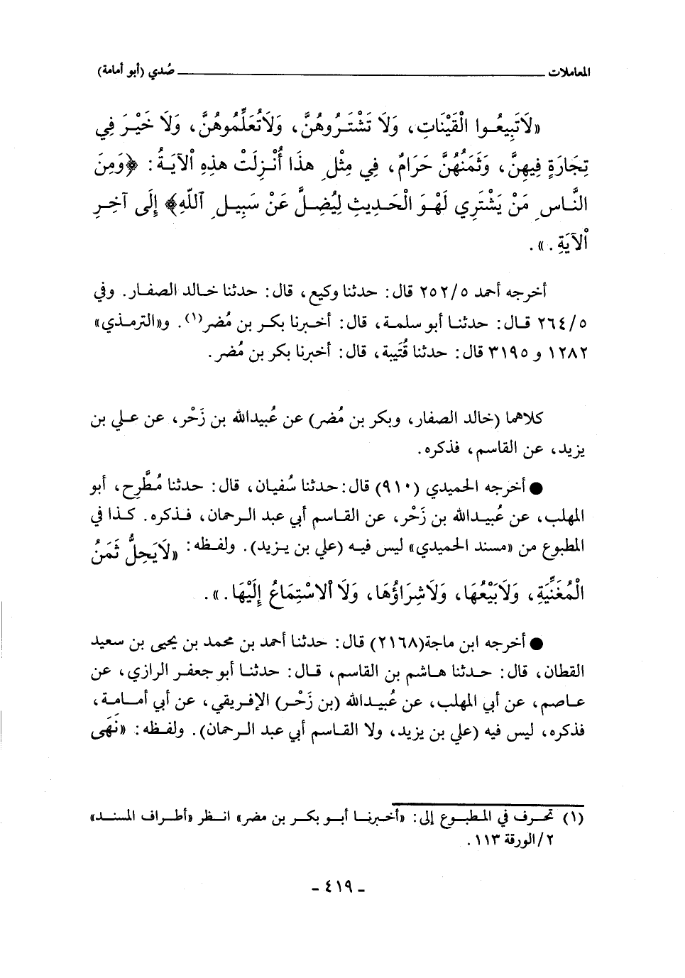 - وأخرجه الْحُمَيْدِىُّ (٩١٥) قَالَ: حَدَّثَنَا سُفْيَانُ. قَالَ: حَدَّثَنَا مُطَّرِحُ أَبُو الْمُهَلَّبِ , عَنْ عُبَيْدِ اللَّهِ بْنِ زَحْرٍ , عَنِ الْقَاسِمِ أَبِى عَبْدِ الرَّحْمَانِ , عَنْ أَبِى أَمَامَةَ , أَنَّ رَسُولَ اللَّهِ , صلى الله عليه وسلم , قَالَ: لَا يَحِلُّ ثَمَنُ الْمُغَنِّيَةِ , وَلَا بَيْعُهَا , وَلَا شِرَاؤُهَا , وَلَا الاِسْتِمَاعُ إِلَيْهَا.