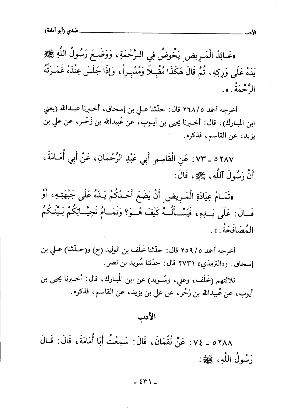 ٥٢٨٧ - عَنِ الْقَاسِمِ أَبِى عَبْدِ الرَّحْمَانِ عَنْ أَبِى أُمَامَةَ رَضِىَ اللَّهُ عَنْهُ أَنَّ رَسُولَ اللَّهِ صلى الله عليه وسلم قَالَ: