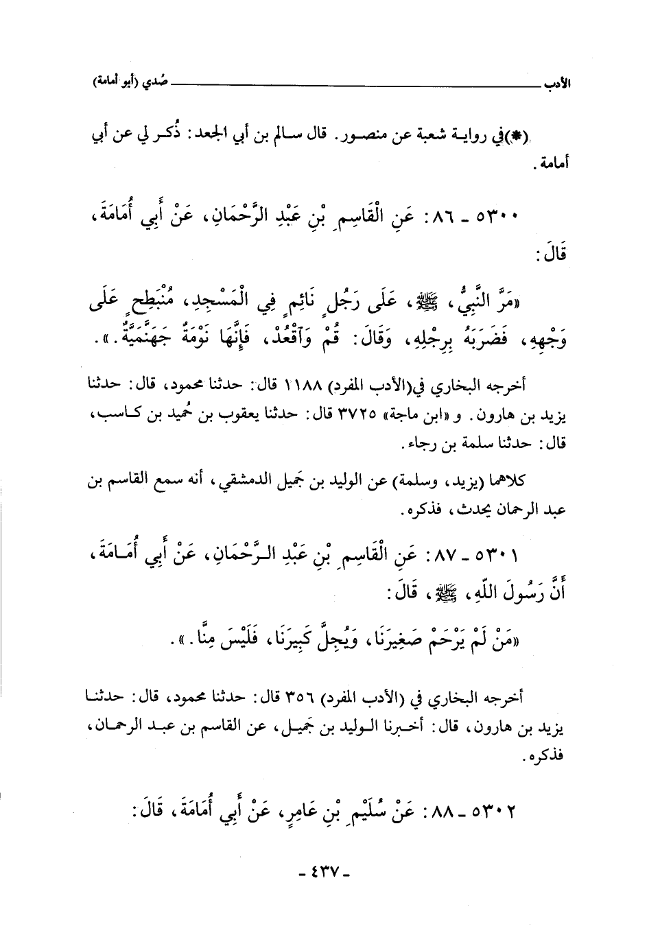 ٥٣٠٠ - عَنِ الْقَاسِمِ بْنَ عَبْدِ الرَّحْمَانِ يُحَدِّثُ عَنْ أَبِى أُمَامَةَ قَالَ: