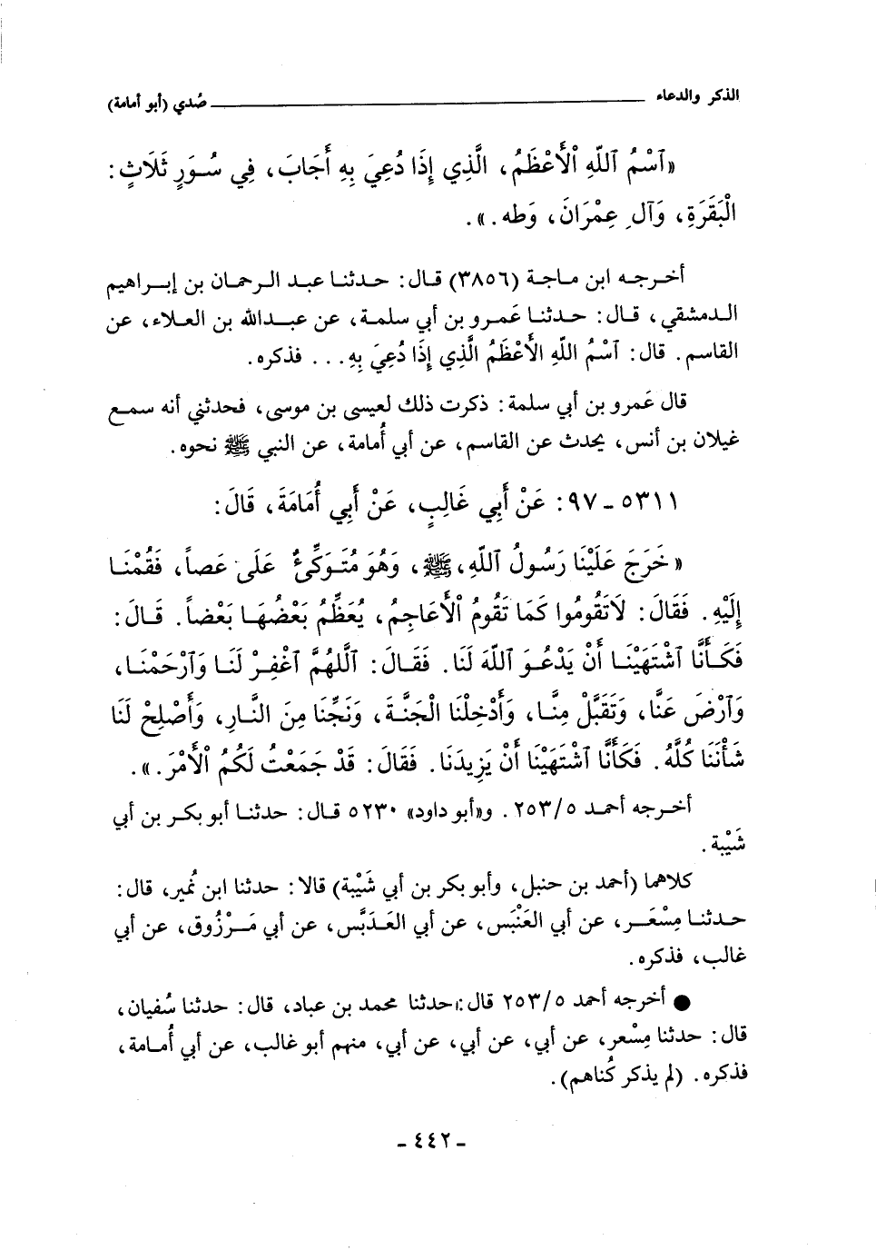 - أخرجه عبد الله بن أحمد ٥/ ٢٥٣ (٢٢٥٣٥) قال: حدثنا محمد بن عباد، حدَّثنا سُفيان، حدَّثنا مِسْعر، عن أبي، عن أبي، عن أبي، منهم أبو غالب، عن أبي أُمامة، عن النبي , صلى الله عليه وسلم , مثله , أو نحوه (لم يذكر كُناهم.