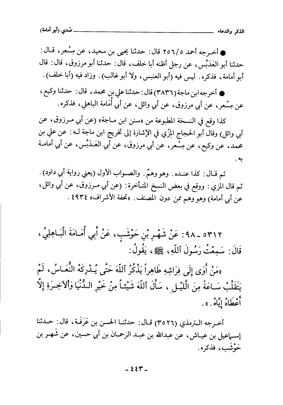 ٥٣١٢ - عَنْ شَهْرِ بْنِ حَوْشَبٍ عَنْ أَبِى أُمَامَةَ الْبَاهِلِىِّ قَالَ سَمِعْتُ رَسُولَ اللَّهِ صلى الله عليه وسلم يَقُولُ: