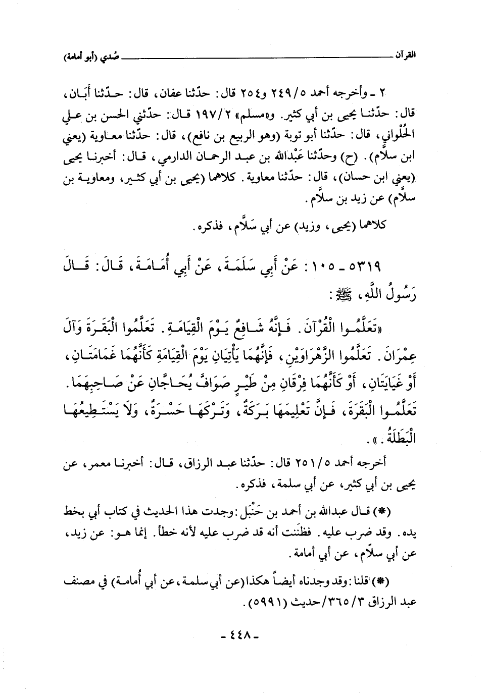 (*) قَالَ عَبْدُ اللَّهِ بن أحمد بن حنبل: وَجَدْتُ هَذَا الْحَدِيثَ فِى كِتَابِ أَبِى بِخَطِّ يَدِهِ. وَقَدْ ضَرَبَ عَلَيْهِ. فَظَنَنْتُ أَنَّهُ قَدْ ضَرَبَ عَلَيْهِ لأَنَّهُ خَطَأٌ. إِنَّمَا هُوَ: عَنْ زَيْدٍ , عَنْ أَبِى سَلَاّمٍ , عَنْ أَبِى أُمَامَةَ.