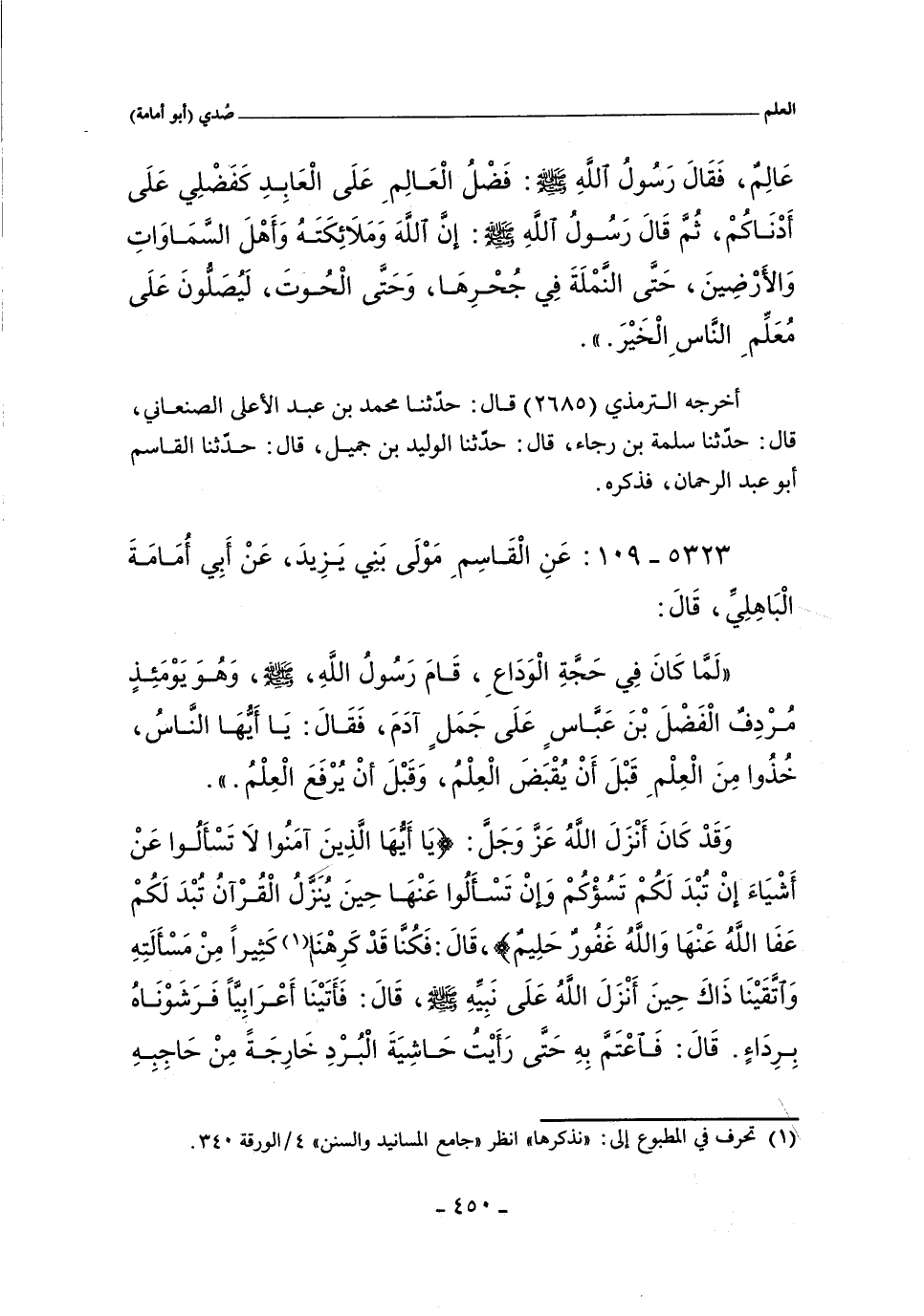 عَالِمٌ فَقَالَ رَسُولُ اللَّهِ صلى الله عليه وسلم فَضْلُ الْعَالِمِ عَلَى الْعَابِدِ كَفَضْلِى عَلَى أَدْنَاكُمْ ثُمَّ قَالَ رَسُولُ اللَّهِ صلى الله عليه وسلم إِنَّ اللَّهَ وَمَلَائِكَتَهُ وَأَهْلَ السَّمَوَاتِ وَالأَرْضِ حَتَّى النَّمْلَةَ فِى جُحْرِهَا وَحَتَّى الْحُوتَ لَيُصَلُّونَ عَلَى مُعَلِّمِ النَّاسِ الْخَيْرَ.