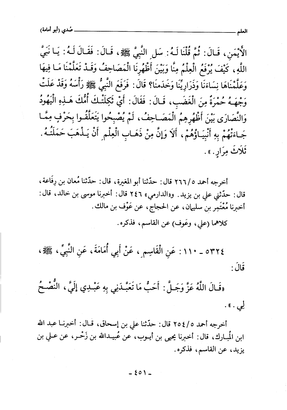 قَالَ ثُمَّ قُلْنَا لَهُ سَلِ النَّبِىَّ صلى الله عليه وسلم قَالَ فَقَالَ لَهُ يَا نَبِىَّ اللَّهِ كَيْفَ يُرْفَعُ الْعِلْمُ مِنَّا وَبَيْنَ أَظْهُرِنَا الْمَصَاحِفُ وَقَدْ تَعَلَّمْنَا مَا فِيهَا وَعَلَّمْنَاهَا نِسَاءَنَا وَذَرَارِيَّنَا وَخَدَمَنَا قَالَ فَرَفَعَ النَّبِىُّ صلى الله عليه وسلم رَأْسَهُ وَقَدْ عَلَتْ وَجْهَهُ حُمْرَةٌ مِنَ الْغَضَبِ قَالَ فَقَالَ إِى ثَكِلَتْكَ أُمُّكَ وَهَذِهِ الْيَهُودُ وَالنَّصَارَى بَيْنَ أَظْهُرِهِمُ الْمَصَاحِفُ لَمْ يُصْبِحُوا يَتَعَلَّقُوا بِحَرْفٍ مِمَّا جَاءَتْهُمْ بِهِ أَنْبِيَاؤُهُمْ أَلَا وَإِنَّ مِنْ ذَهَابِ الْعِلْمِ أَنْ يَذْهَبَ حَمَلَتُهُ ثَلَاثَ مِرَارٍ.